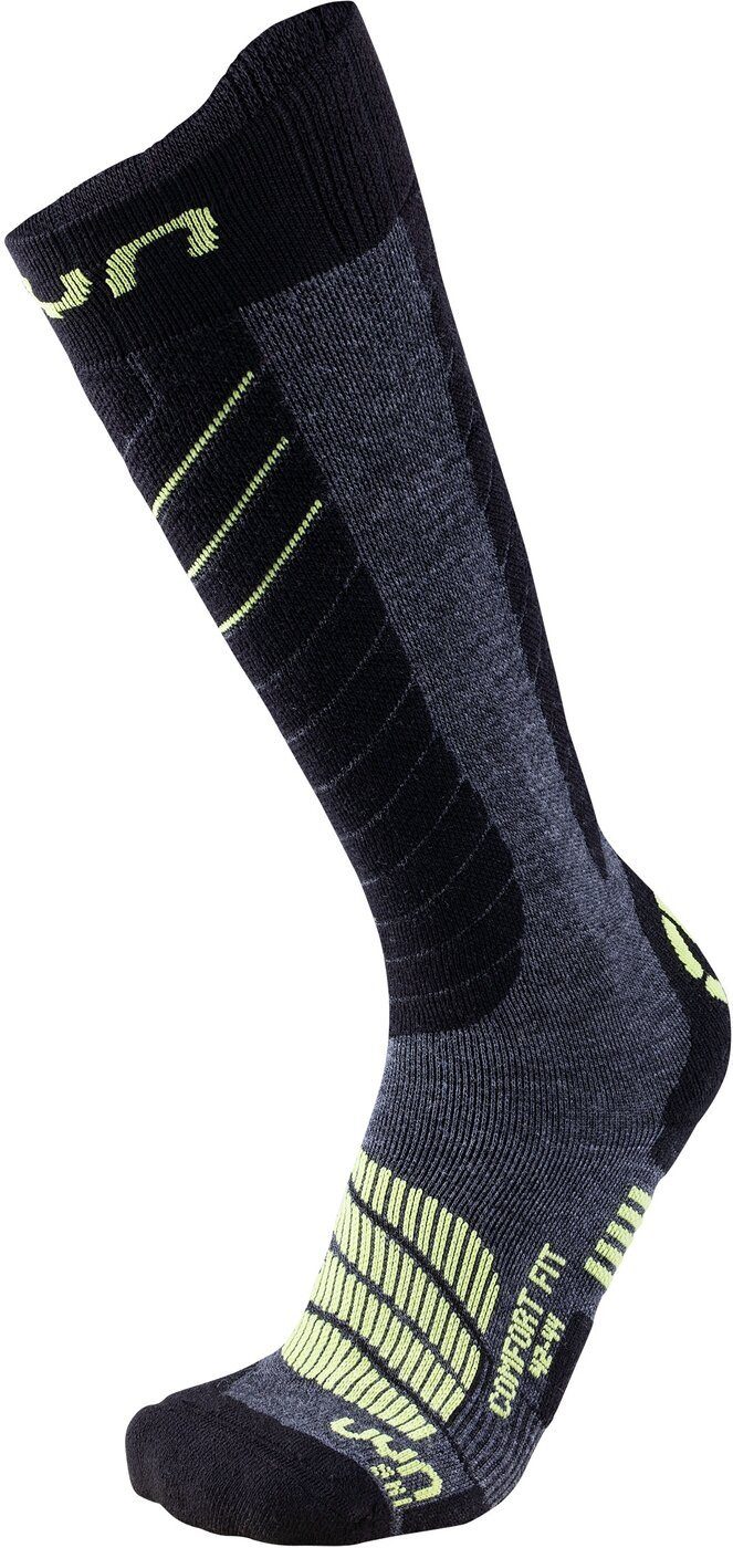 UYN® SKI COMFORT FIT MAN. Ski Comfort Fit – der Name der Skisocken von UYN® ist Programm. Denn mit ihrem ergonomisch geformten Fußbett, ihren verschiedenen Schutz- und Stützbereichen wie am Knöchel und an der Achillessehne sowie stoßdämpfenden Elementen sitzen sie perfekt. Die hochwertige Merinowolle garantiert darüber hinaus zu jeder Zeit höchsten Tragekomfort sowie eine effektive Wärmeisolierung. Kombiniert wird dies mit Technologien, die für eine ideale Belüftung sorgen und mit Natex, einer Nylonfaser auf 100 Prozent pflanzlicher Basis, für bestes Klima-Management.