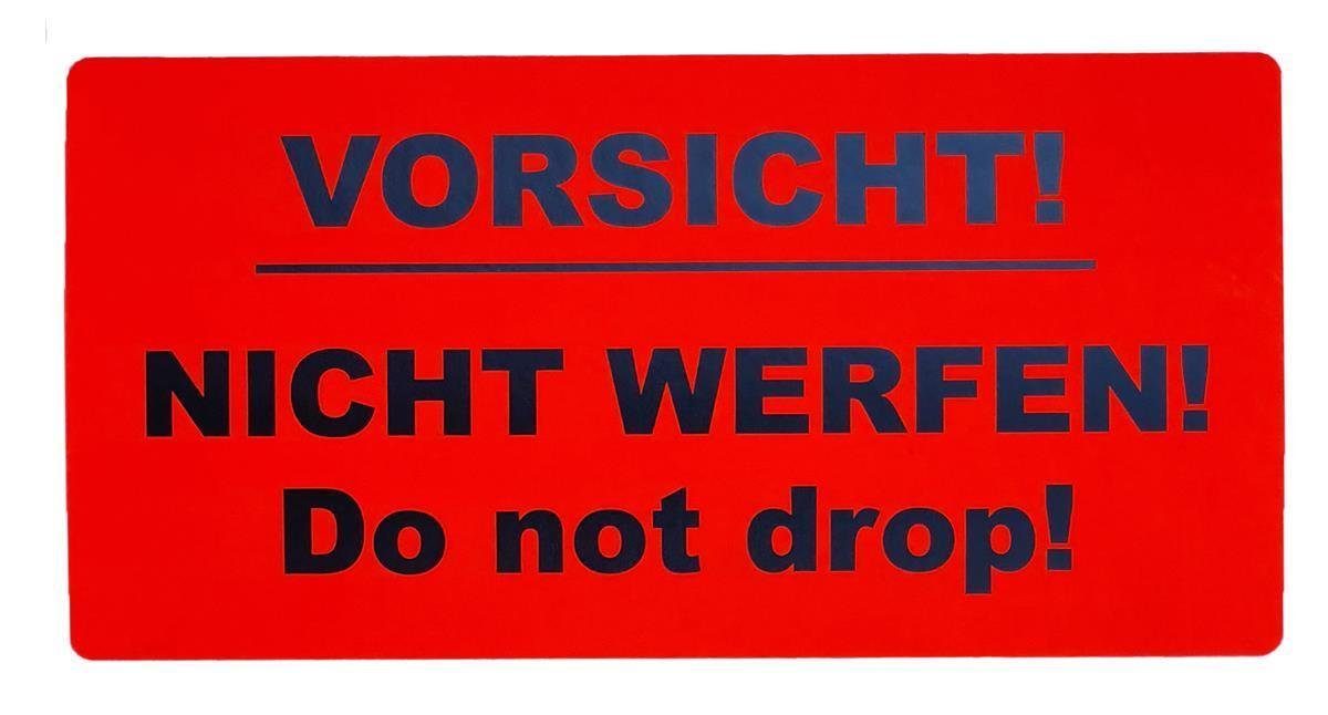 Aufgedruckt auf Leuchtfarbenpapier mit einer Grammatur von 76 g/m². Die Signalfarbe sticht sofort ins Auge. Die Schwarze Schrift wurde durch einen Flexodruck realisiert und sorgt für den entsprechenden Kontrast auf dem Leuchtfarbenpapier. Die einzelnen Etiketten haben eine Размер von 100 x 50 mm und werden zu je 50 Stück geliefert.