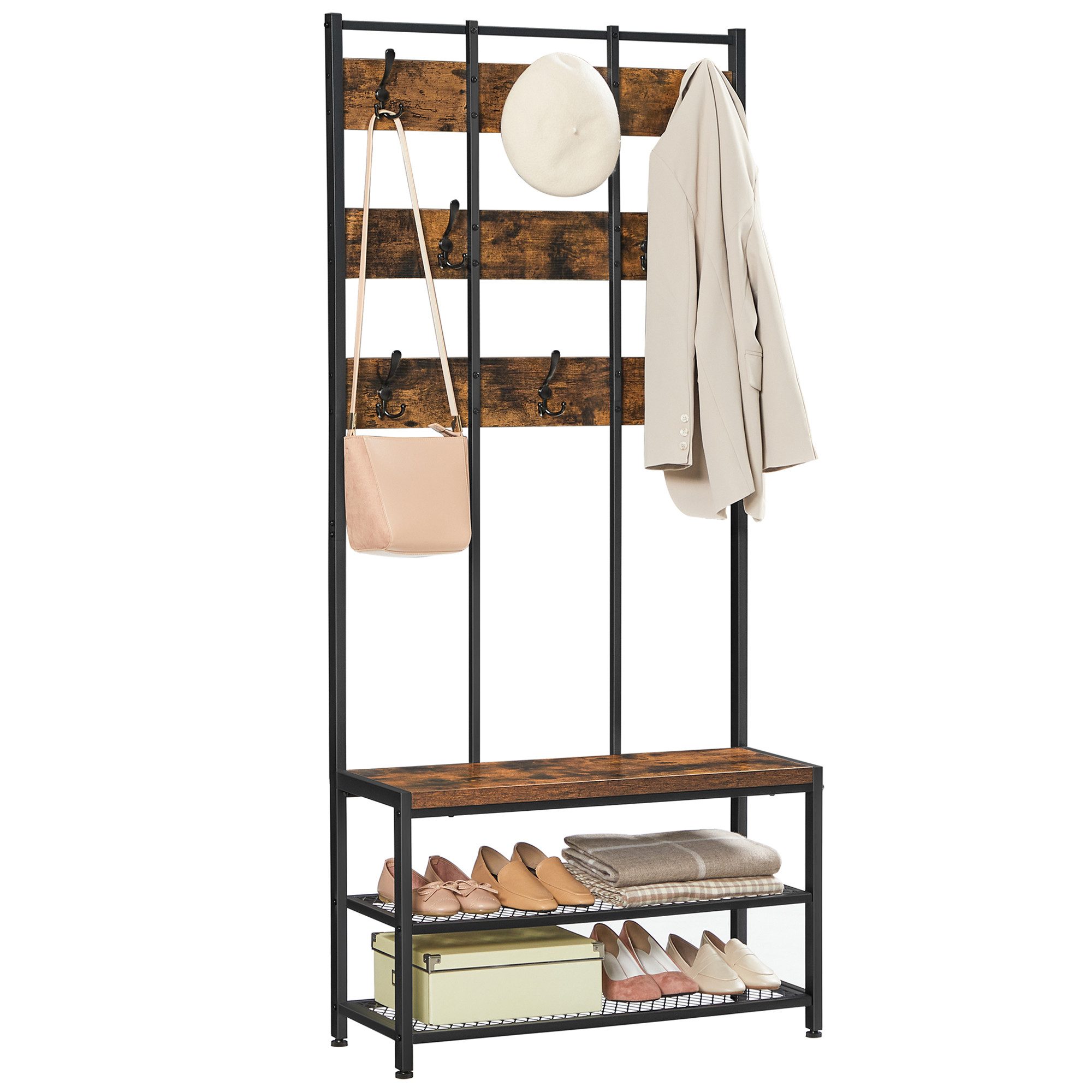 Ausstattung | mit 8 Haken und Sitzfläche, mit 2 Gitterablagen |