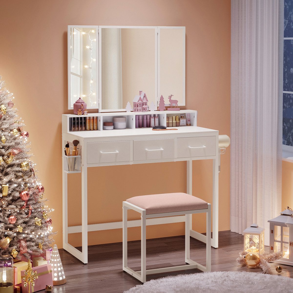 Ausstattung | mit haartrockner-Halter 1 Aufbewahrungsbox (8 x 8 x 10 cm) 3-teiligem Klappspiegel gepolstertem Hocker 3 Schubladen |