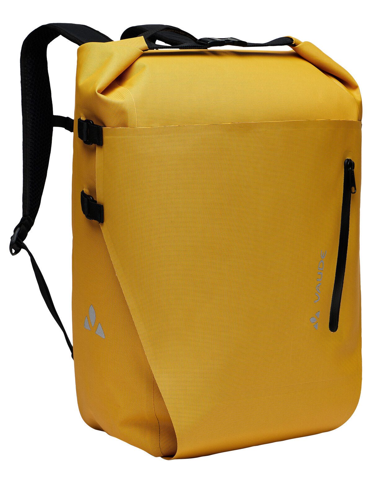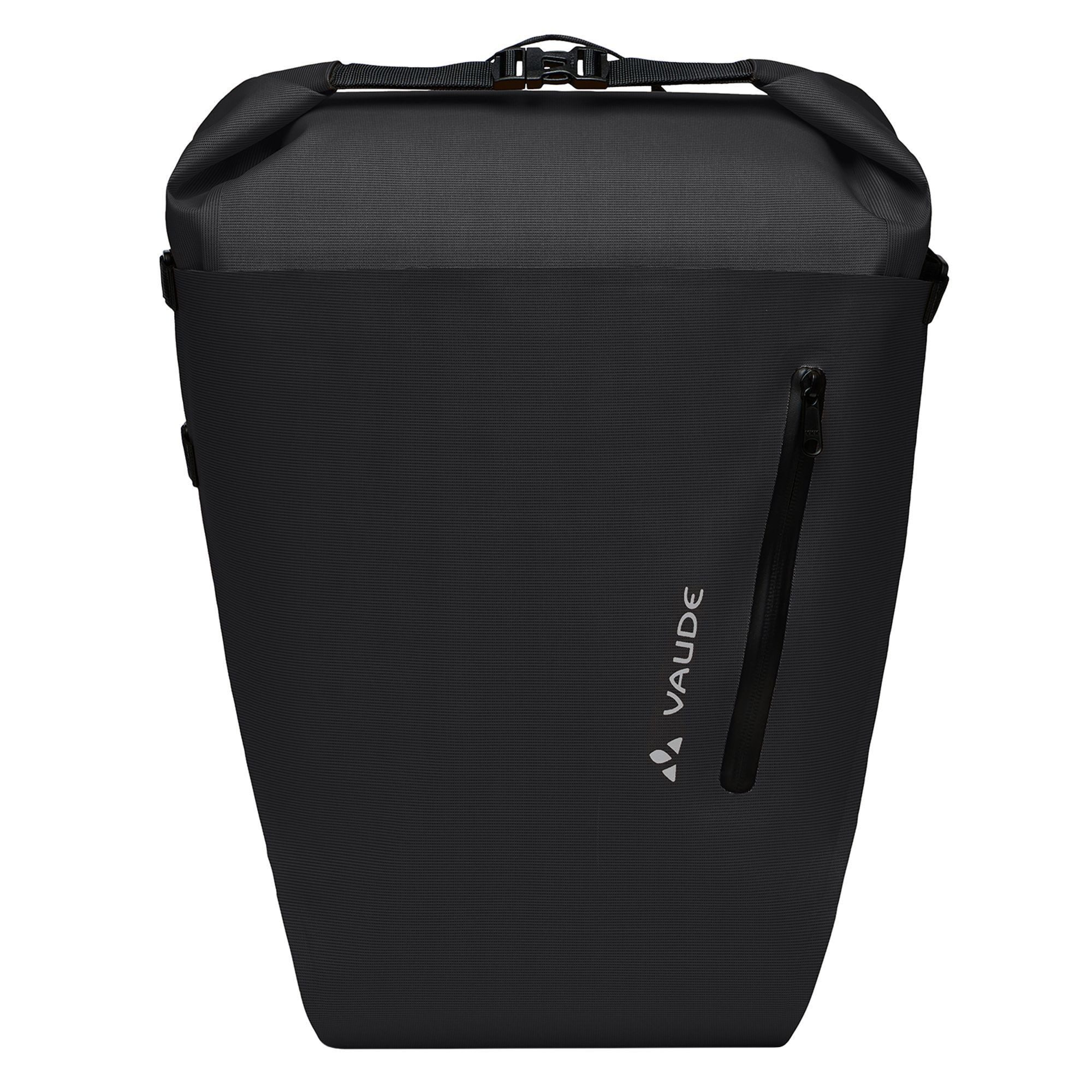 Innovative, 100 Prozent wasserdichte 2in1 Rucksack-Fahrradtasche Made in Germany in geradlinigem, zeitlosen Design fürs Pendeln oder Touren. Der mit 27 Litern sehr geräumige Rolltop Rucksack kommt mit gepolstertem Rücken, ergonomischen Schulterträgern und Brustgurt und lässt sich im Handumdrehen in eine Fahrrad Gepäckträgertasche verwandeln. Die Schulterträger werden in einer Netztasche am Rucksackrücken verstaut und mit der umlegbaren Frontabdeckung gesichert. Diese verfügt über eine Einschubtasche mit wasserdichtem Reißverschluss und ist zum Säubern komplett abnehmbar. Dank des bewährten QMR 2.0 Befestigungssystems wird die 2in1 Rucksack-Fahrradtasche sicher am Gepäckträger (mit runden Rohren von 8 bis max. 16 mm) angebracht und lässt sich auf Zug am Band, das die zwei Haken verbindet, rasch wieder lösen. Die QMR-Haken sind mit einem kleinen Bügelschloss (z. B. TSA-Schloss, nicht im Lieferumfang enthalten) abschließbar. Die Rucksack-Radtaschen-Kombination bietet viel Stauraum mit einem durchdachten Innenleben: ein polstertes Laptopfach für Geräte bis 13,3"" mit außen liegenden zusätzlichen Einsteckfächern für Smartphone, Stifte & Co. Je nach Beladung kann die 2in1 Rucksack Fahrradtasche in 3 Stufen seitlich komprimiert werden. Das robuste Taschen-Material in textiler Optik wird in der VAUDE Manufaktur wasserdicht verschweißt und ist komplett PVC-frei. Mit reflektierenden Logos.