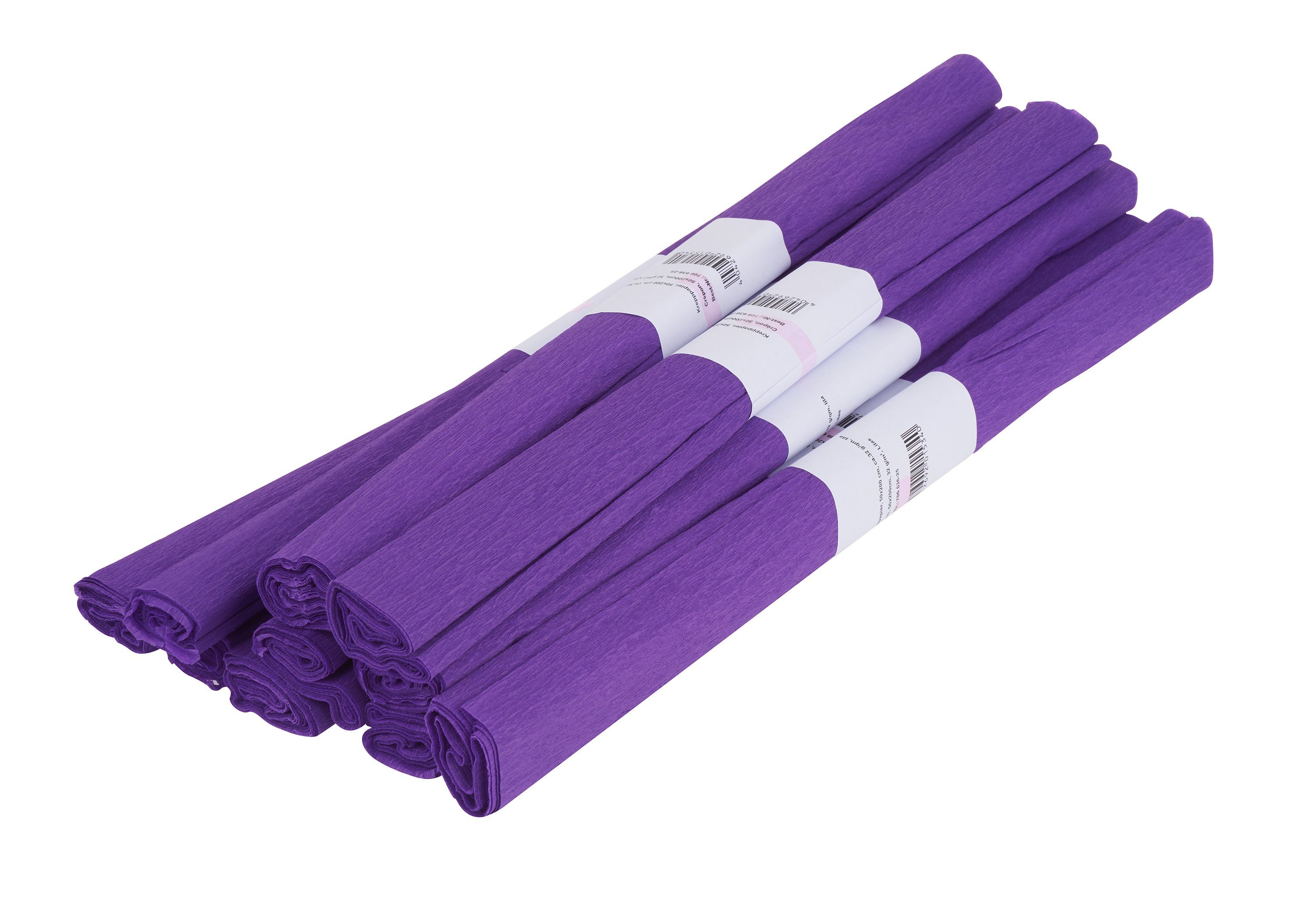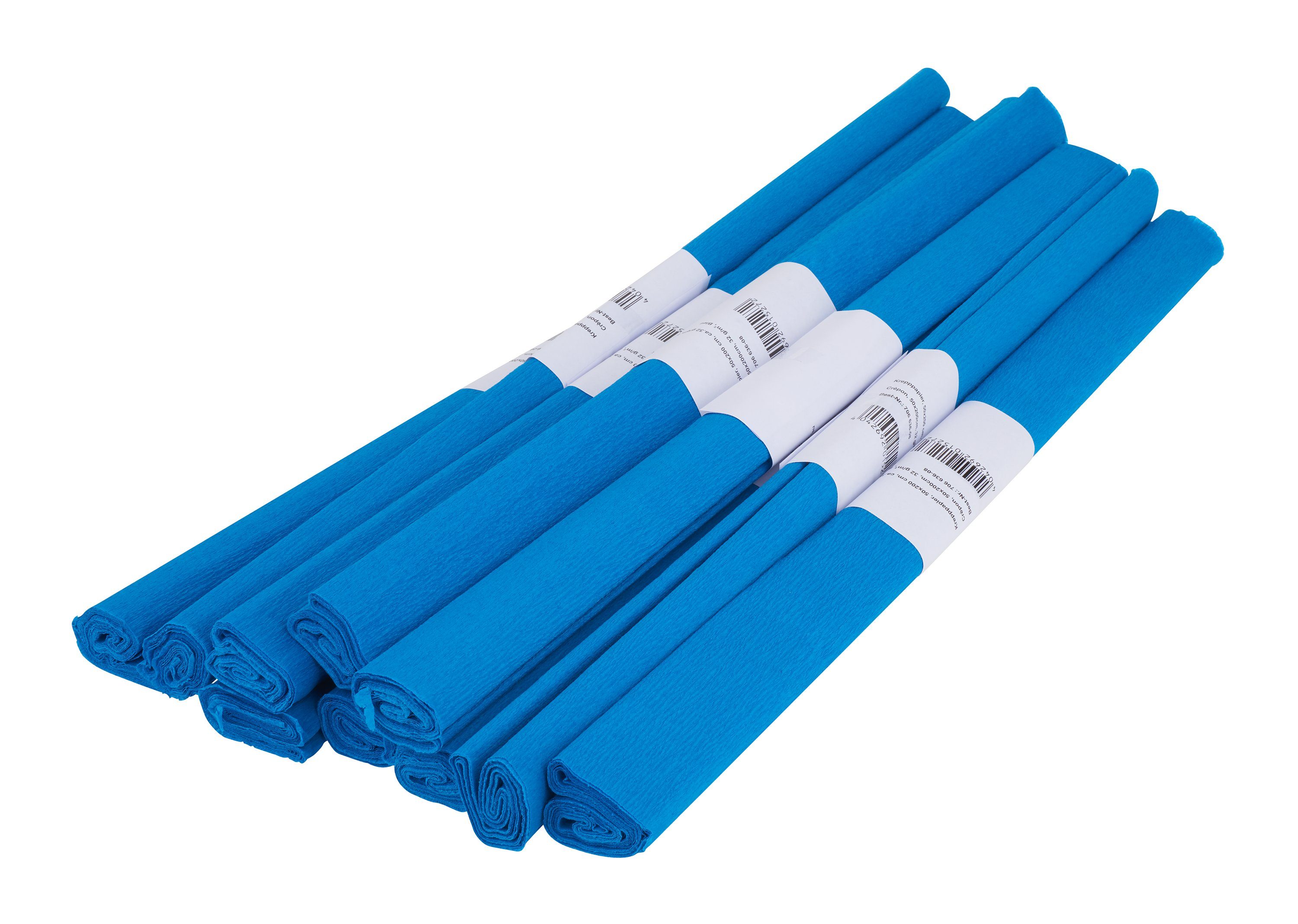10 Rollen Krepppapier farbig sortiert. 2 m pro Rolle mit einer Breite von 50 cm. Gewicht 32 g/m².