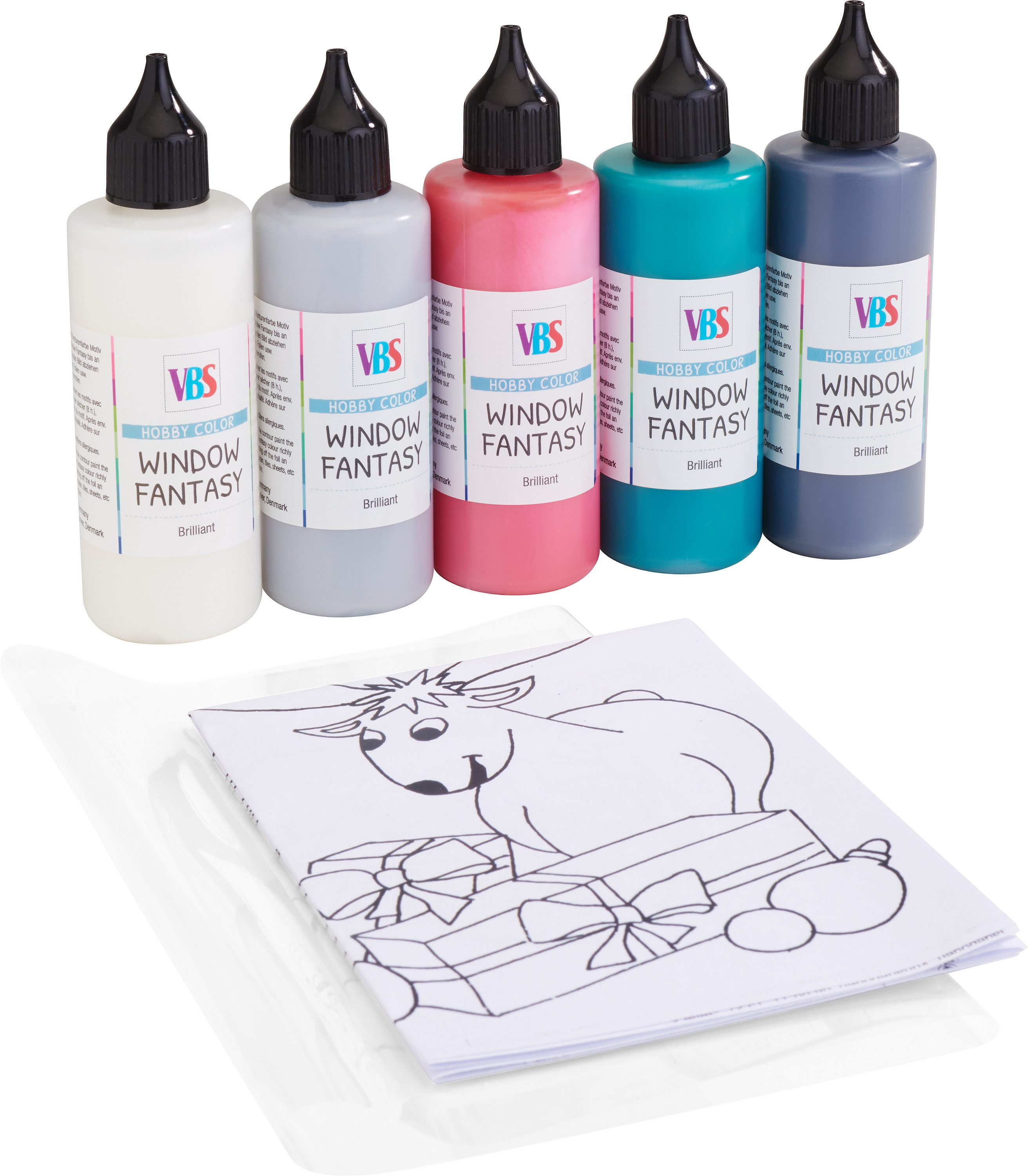 Fenstermalfarbe Window Color im Set mit niedlichen, weihnachtlichen Motiven wie Rentiere, Mäuse und Sterne. Das Set enthält 4 Fenstermalfarben in Weiß, Karminrot, Blattgrün und Grau, eine Konturenfarbe in Schwarz sowie Malfolie und Vorlagenbogen. Die Farben sind ideal auf die Motive abgestimmt und zeichnen sich durch hohe Farbbrillaz aus.
