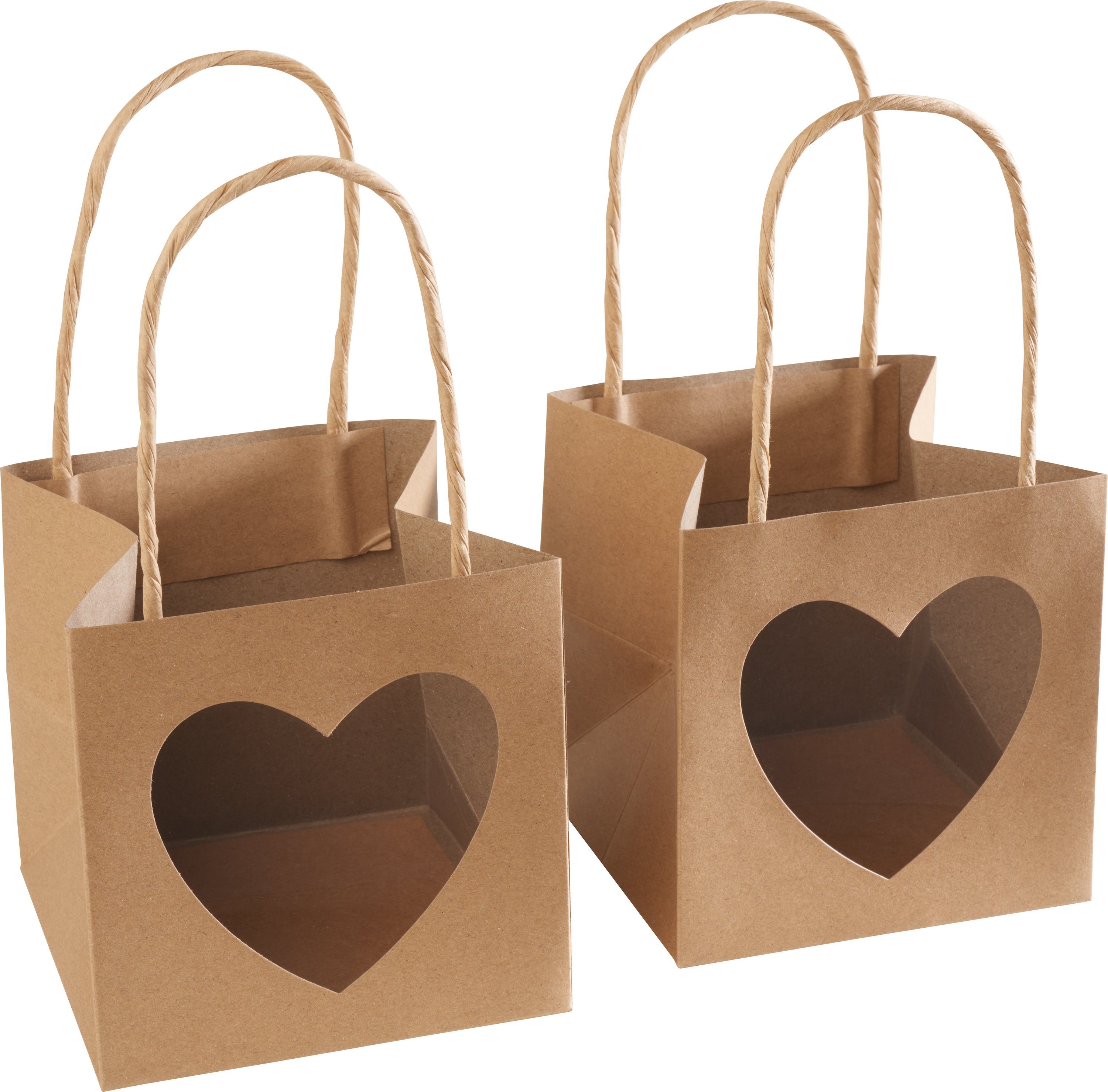 VBS Kraftpapiertüte 'Herz', 2 Stück mit einer Размер von ca. 12 x 12 x 12 cm. Das Sichtfenster in Herzform ist mit Kunststofffolie hinterlegt und hat einen Ø von ca. 8,5 cm. Die stabilen Tragegriffe sind ca. 24,5 cm lang. Eine romantische Tüte, die sich nach Belieben mit Bastelfarben, Handlettering, Stickern, Schleifenband und Glitter verzieren lässt. Noch mit einem Anhänger und Namen versehen, lassen sich kleine Geschenke, Aufmerksamkeiten und verpackte Leckereien prima an die Liebsten verschenken. Ideal auch für verschiedene Anlässe wie Valentinstag, Muttertag und zur Hochzeit.