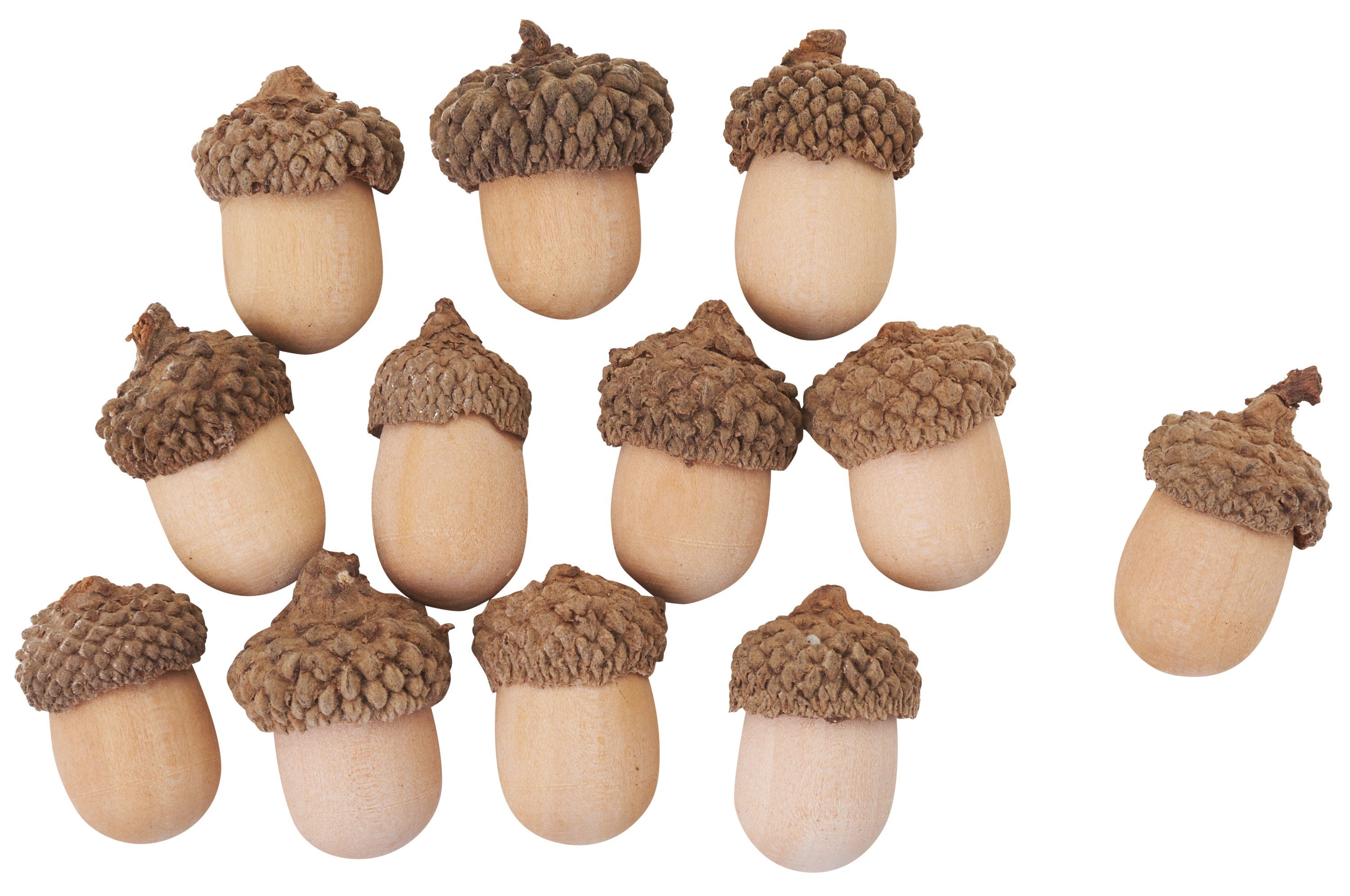 VBS Eichel 'Oakley', 12 Stück sind ca. 2,8 cm hoch und ca. 2,3 cm breit. Da der Kopf der Eichel aus Naturmaterial ist, kann es zu Abweichungen in den Maßen kommen. Super zum Gestalten von Herbstdekorationen in Kränzen. Mit Heißkleber werden die Eicheln optimal angeklebt. Wunderbar in Kombination mit Schleifenbändern, Naturmaterialien und kleinen Dekofiguren. Aus Holz.