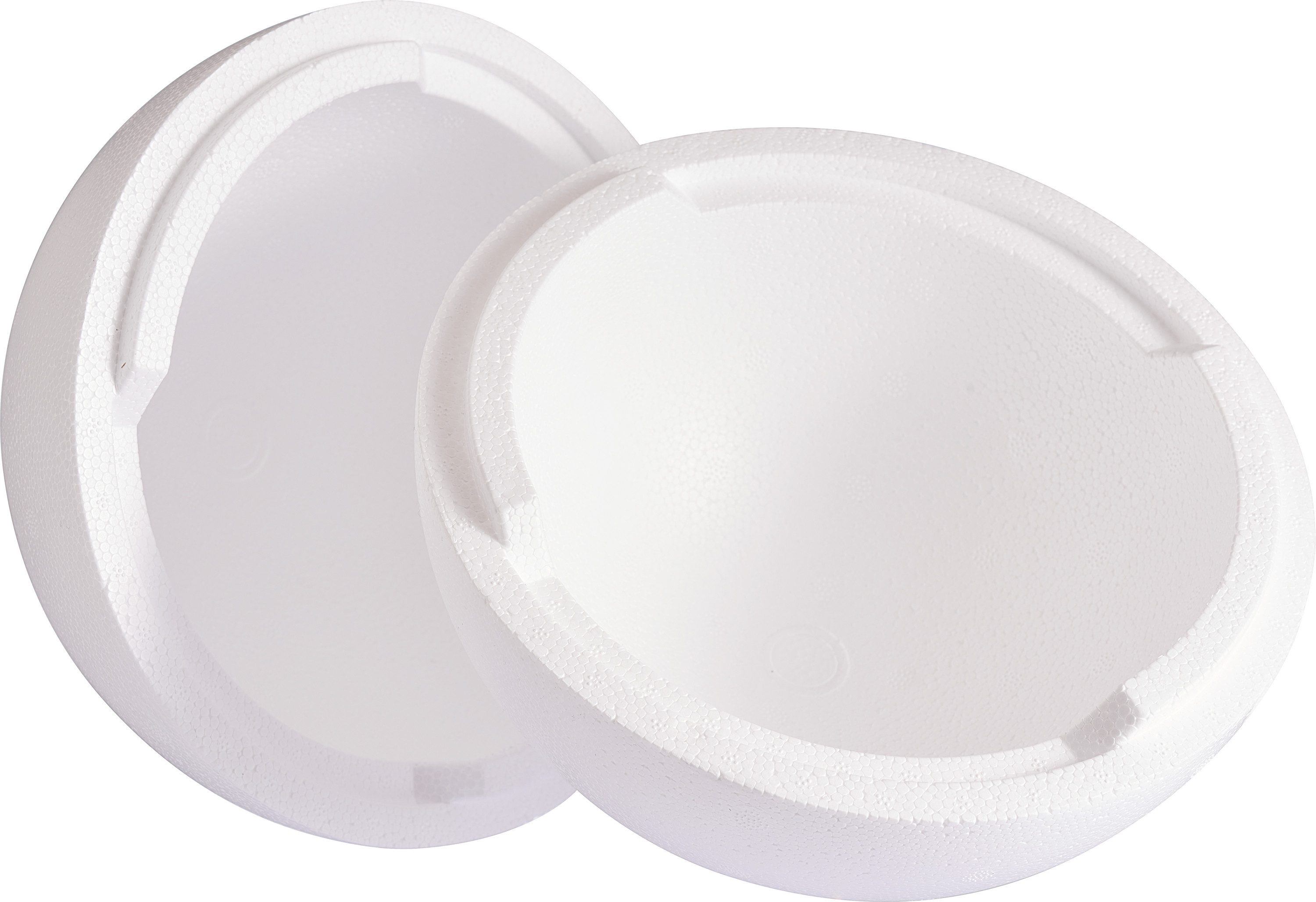 Weiße Styroporkugel mit einem Ø von ca. 20 cm. Die Kugel ist 2-tlg., dementsprrechend teilbar und von innen hohl.