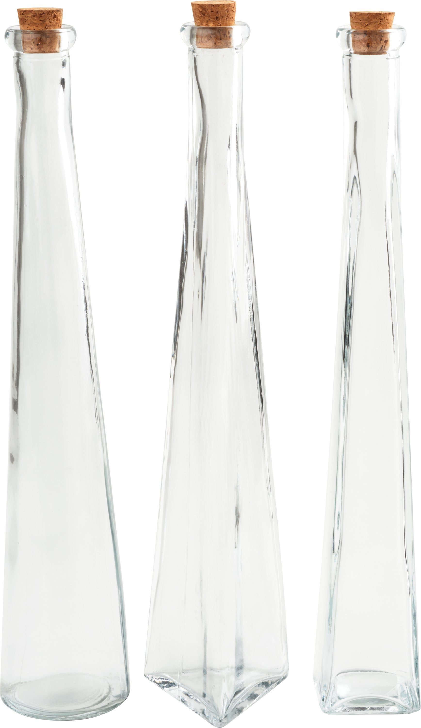 Hübsche schlanke Glasflaschen im 3er-Set.Je eine in der Form oval, viereckig und rund. Durch die optimale Form lassen sich die Flaschen prima als Blumenvase für Stielblumen verwenden. Richtig edel wird es, wenn Sie die Glasflaschen mit Likör füllen - tolle Geschenkidee! Oder befüllt mit Seife oder Deko-Sand wird es zu einer schönen Wohnraumdekoration.Все Flaschen haben einen Verschlusskorken.Aus Klarglas. Höhe ca. 32 cm. Füllmenge ca. 200 ml.