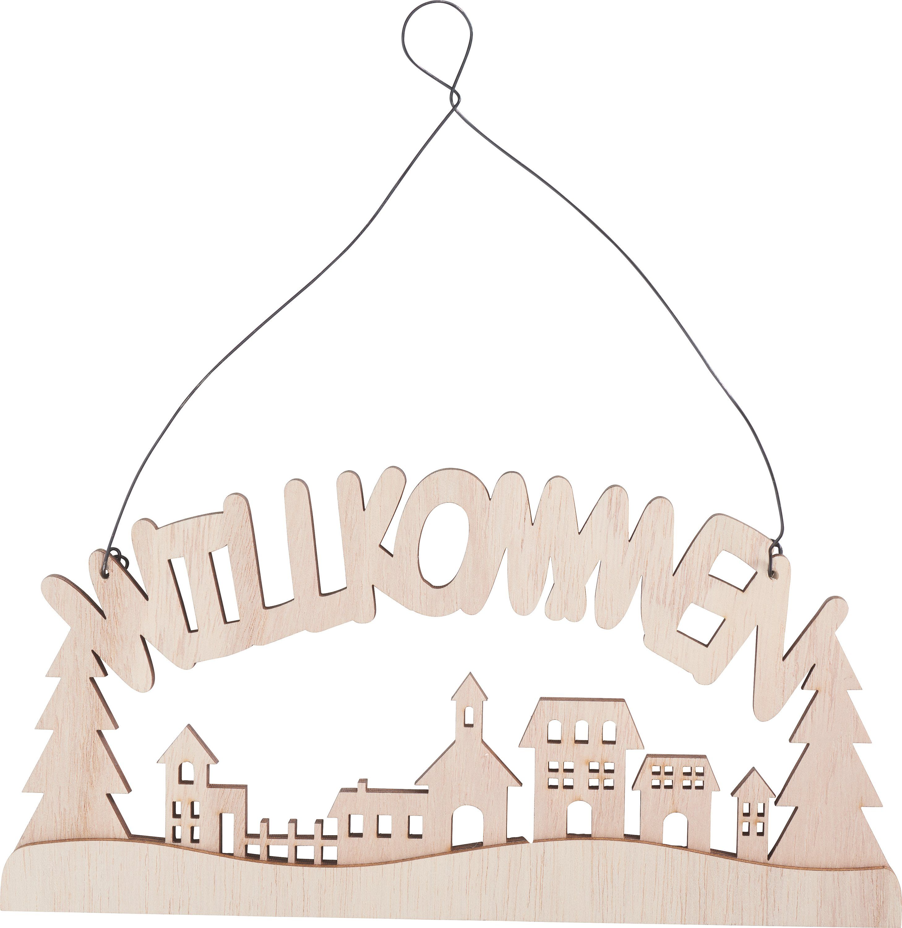 VBS Holz-Schild 'Willkommen' aus furniertem Sperrholz mit Draht zum Aufhängen. Die Размер beträgt ca. L 22 x H 11 cm, Stärke ca. 7,9 mm, Höhe mit Draht ca. 22,5 cm. Ein Motiv aus Häusern, Tannen und dem Schriftzug 'Willkommen'. Eine zauberhafte Dekoration die individuell mit Bastelfarben, Chalky Color, Blattmetall, Trendfarben oder Serviettentechnik gestaltet werden kann. Perfekt für die Dekoration im Haustürkranz oder im Fenster.