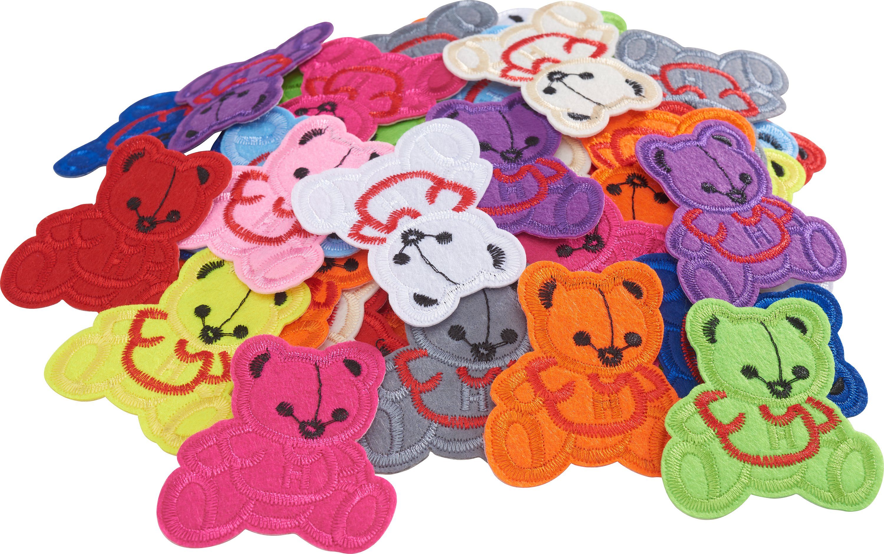 120 Bügelapplikationen 'Bären' als günstige VBS Großpackung. Enthalten sind Applikationen in verschiedenen Farben aus 100 % Polyester, mit einer Размер von ca. 5,9 x 6,5 cm. Ideal zum Ausbessern von Verschmutzungen und Beschädigungen auf Kleidung oder zum Aufpeppen von Kleidung und Dekorationen. Kleiner Tipp: Die Patches haften am besten auf Stoff. Strickbekleidung sollte zusätzlich genäht werden.