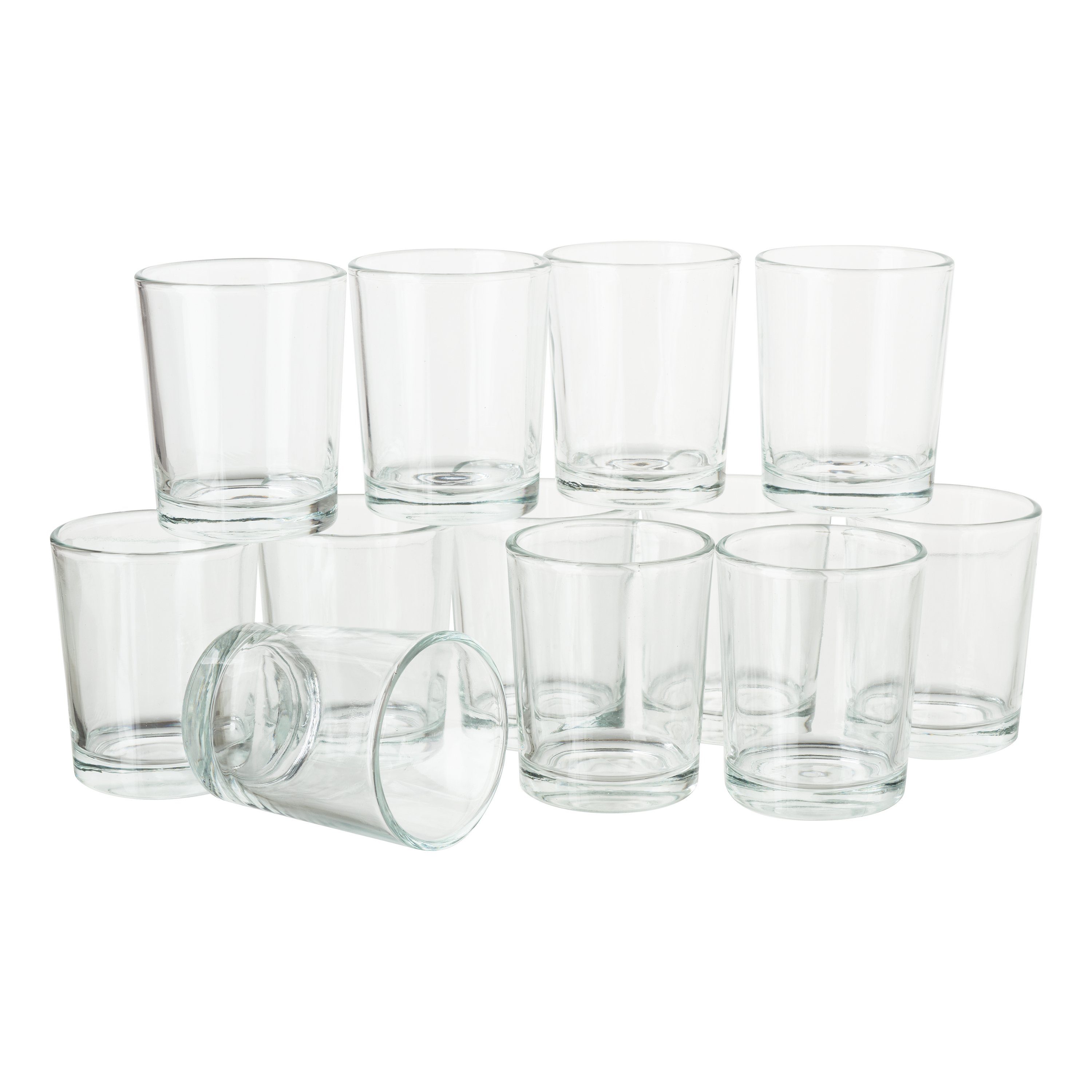 12 Teelichtgläser aus Klarglas mit hoher Glaswand. Jedes Glas ist ca. 6,3 cm hoch.