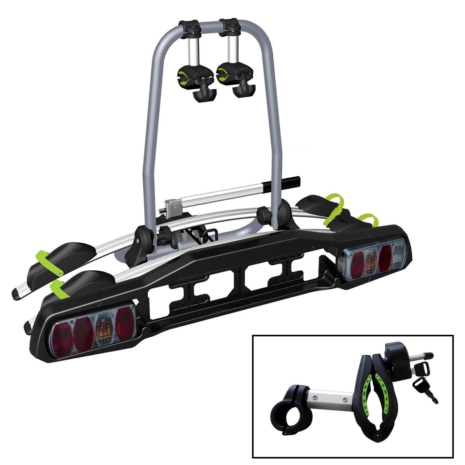 Stabiler und leicht zu montierender Heckträger zur Montage auf der Anhängerkupplung, Transport von bis zu 2 Fahrrädern. Klappbar, damit man auch bei beladenem Träger bequem an den Kofferraum kommt. Der Träger ist einfach an der Anhängerkupplung zu fixieren, mit einem Griff rastet der Träger ein. Genauso einfach ist er auch wieder von der Kupplung wegzunehmen. Einfache Bedienung durch den Hebel. Einfach den Träger auf die Kupplung setzen, und durch Runterdrücken des Hebels wird der Träger arretiert. Träger und Fahrradhalter sind abschließbar, so daß auch während einer Pause Träger und Fahrräder vor Diebstahl sicher sind.