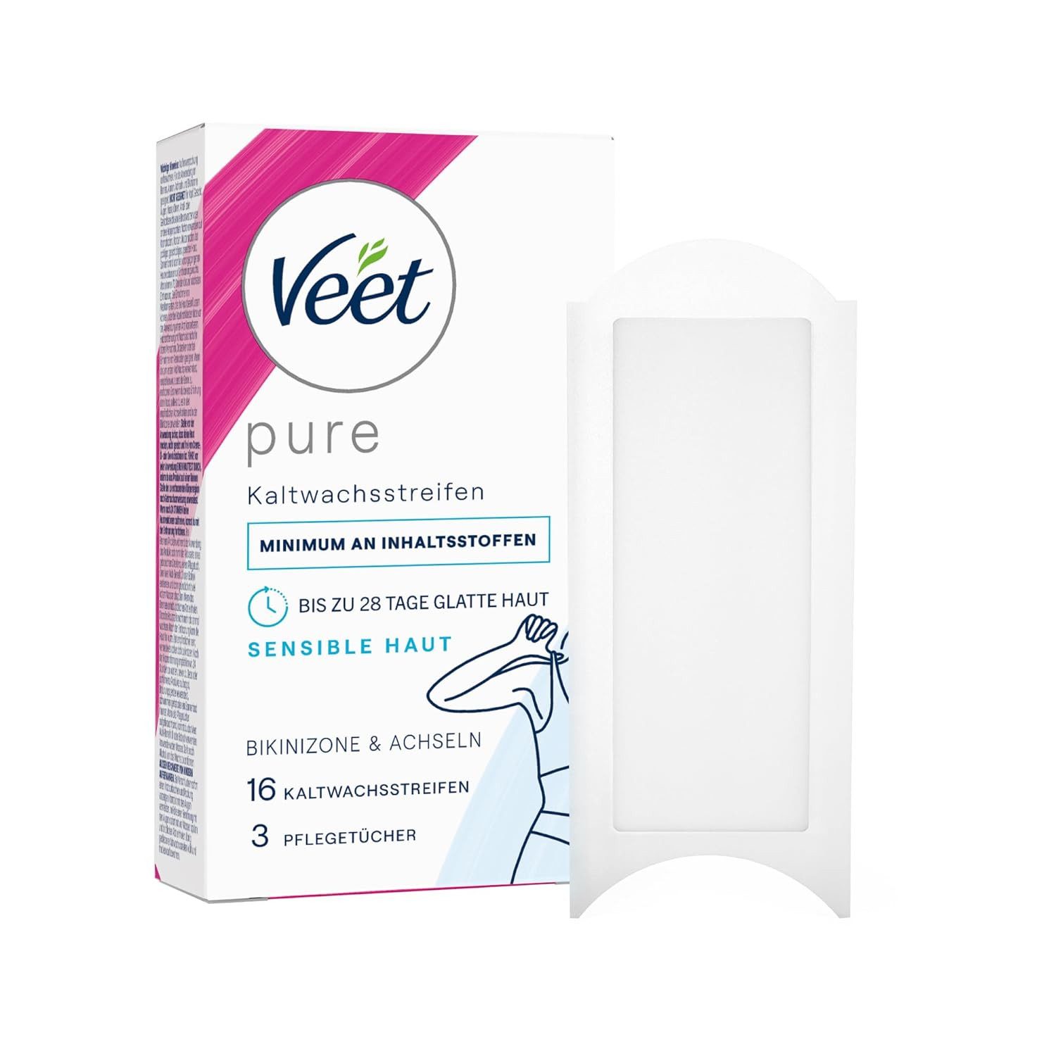 Im Lieferumfang enthalten sind 8 Doppelstreifen der Veet Pure Kaltwachsstreifen für Bikinizone & Achseln für 16 Anwendungen sowie 3 Pflegetücher