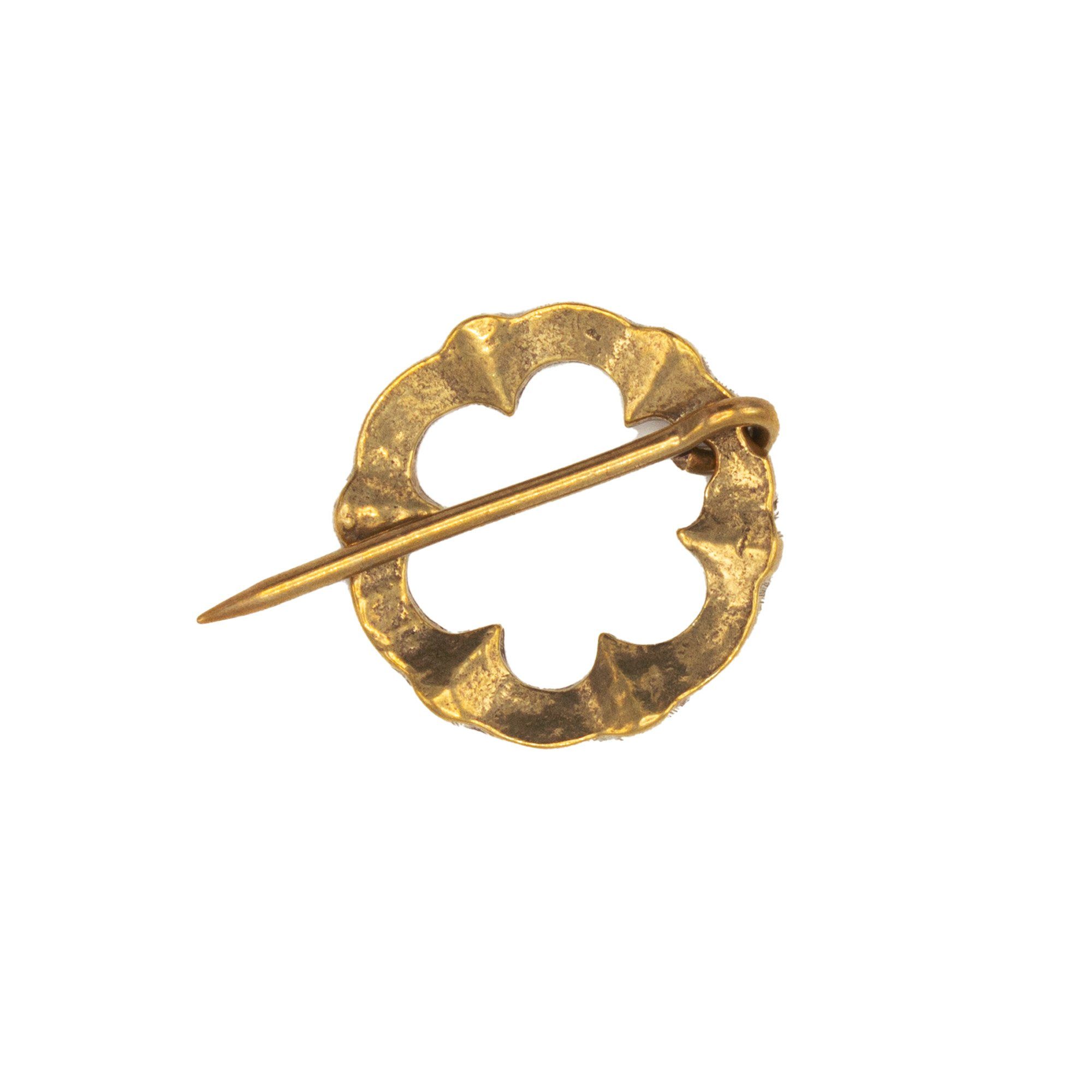 Schöne Messingfibel, auch Fürspann genannt. Die Fibel wurde nach einem Fund gearbeitet, datiert auf das 13. Jh - 14. Jh. Für den Halsausschnitt des Kleides, der Cotte oder andere Verwendungen.