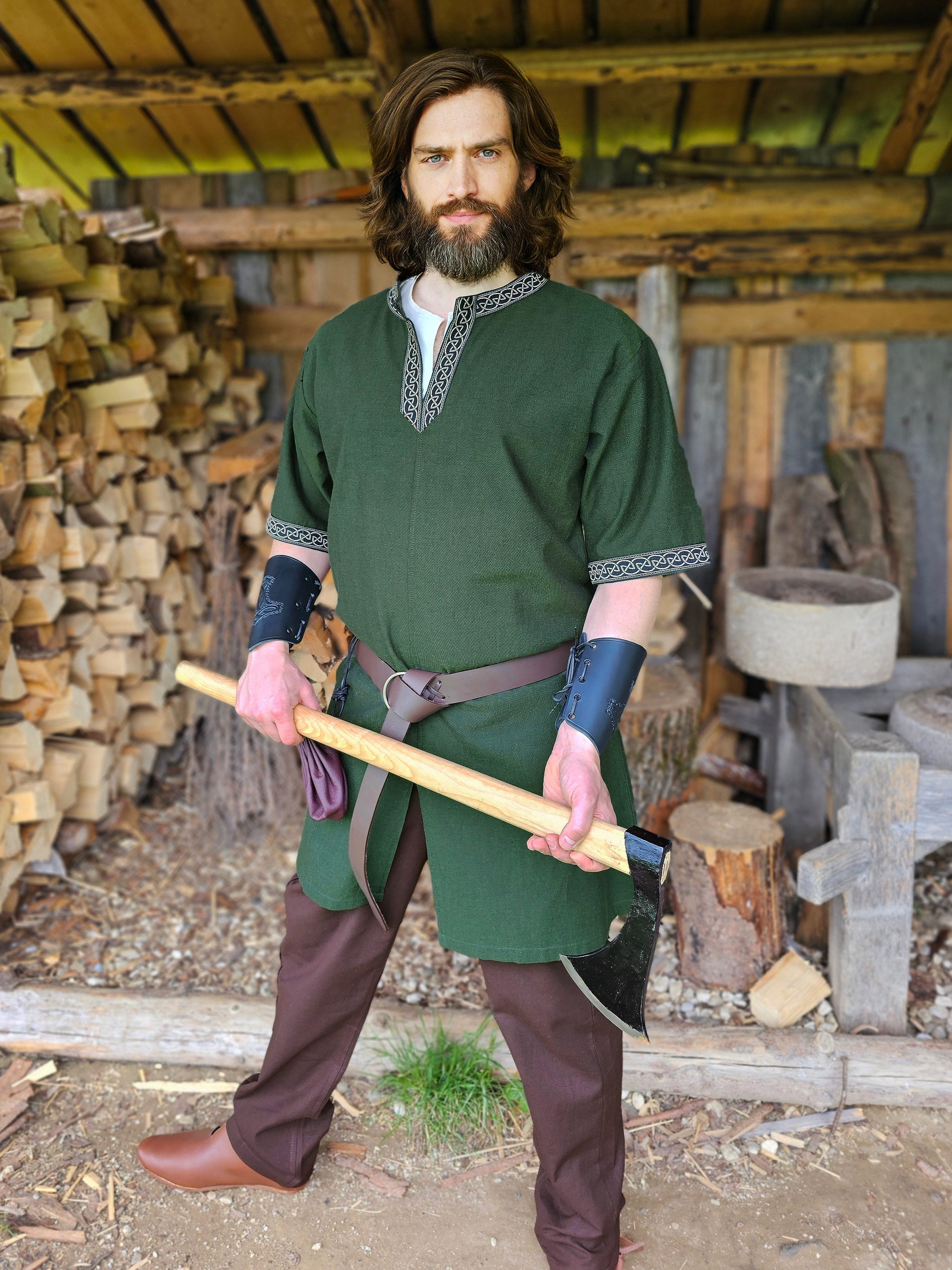 Unsere klassische Wikinger Tunika grün mit Knotenmuster ist durch ihren längeren Schnitt und der Bordüre gut geeignet für die wikingerzeitliche Darstellung. Die Wikingertunika ist aus Baumwolle hergestellt und ist sehr angenehm zu tragen. Sie hat einen Schlitz am Halsausschnitt, um das Anziehen zu erleichtern. Dieser Schlitz könnte mit einer Wikinger Fibel geschlossen werden und erweitert so das Wikinger Outfit. Ebenfalls sind im Schrittbereich Schlitze an der Vorder- und Rückseite eingearbeitet, um so für mehr Beinfreiheit zu sorgen. Die Ärmel sind kurz, wobei die Wikinger Tunika aber nicht nur im Sommer getragen werden kann. Mit z.B. einer langärmeligen Untertunika ist sie auch für kälteren Tage geeignet. Die schöne Borte mit Knotenmuster ist ebenfalls aus Baumwolle gearbeitet. Sie ist am Halsausschnitt sowie an den Ärmelenden angebracht und rundet die Kurzarmtunika ab. Das Knotenmuster ist typisch für das Früh- und Hochmittelalters und passt somit gut zur Darstellung eines Wikingers.