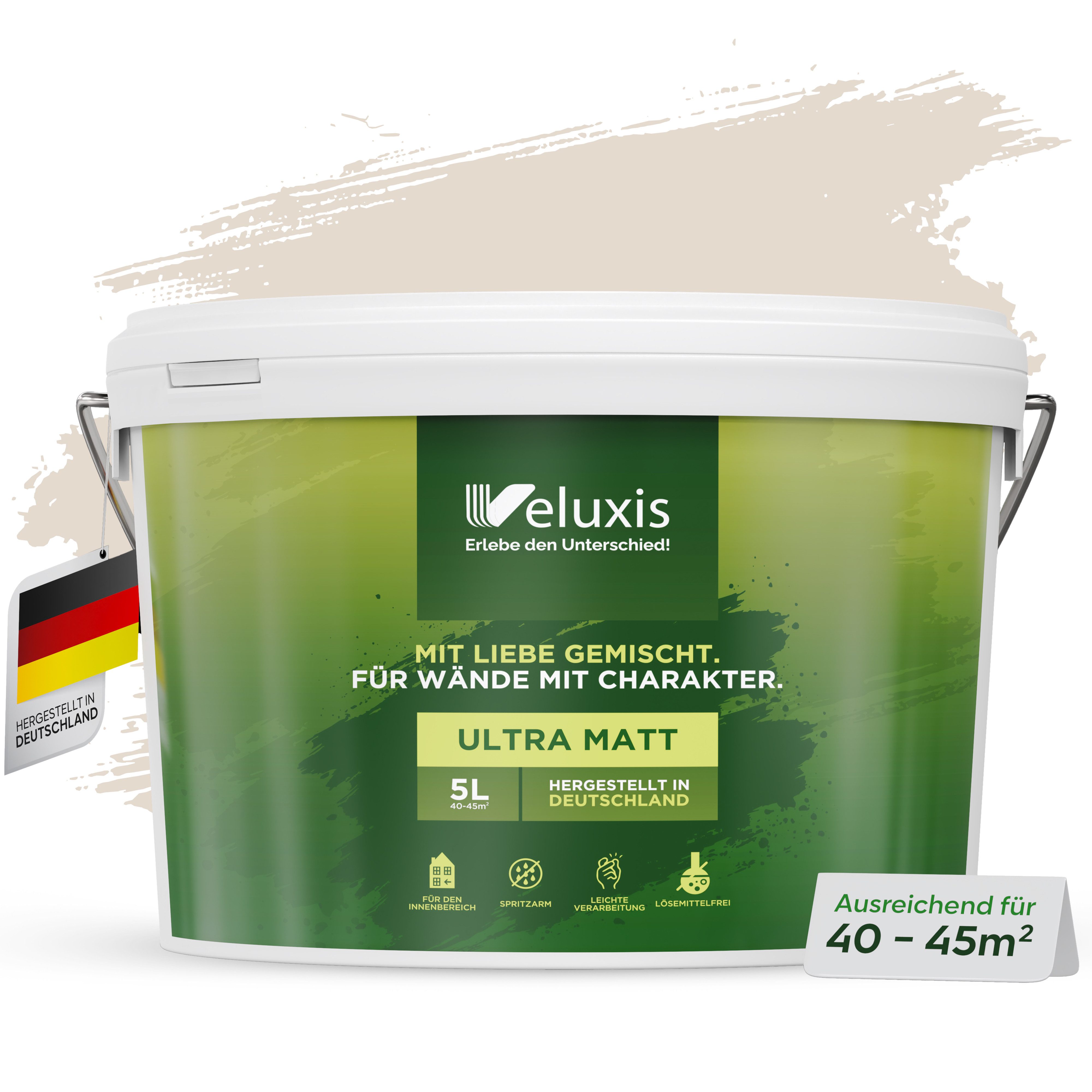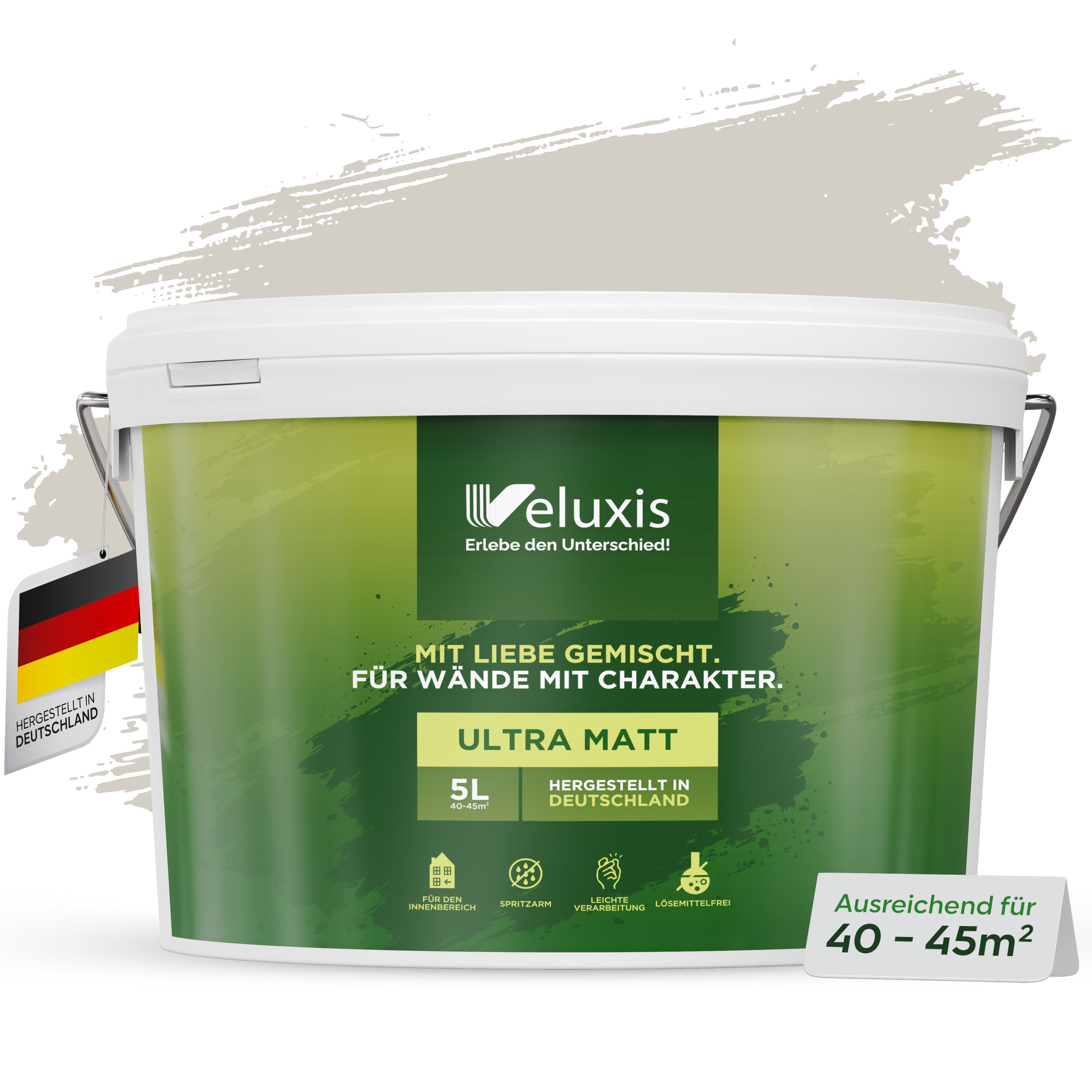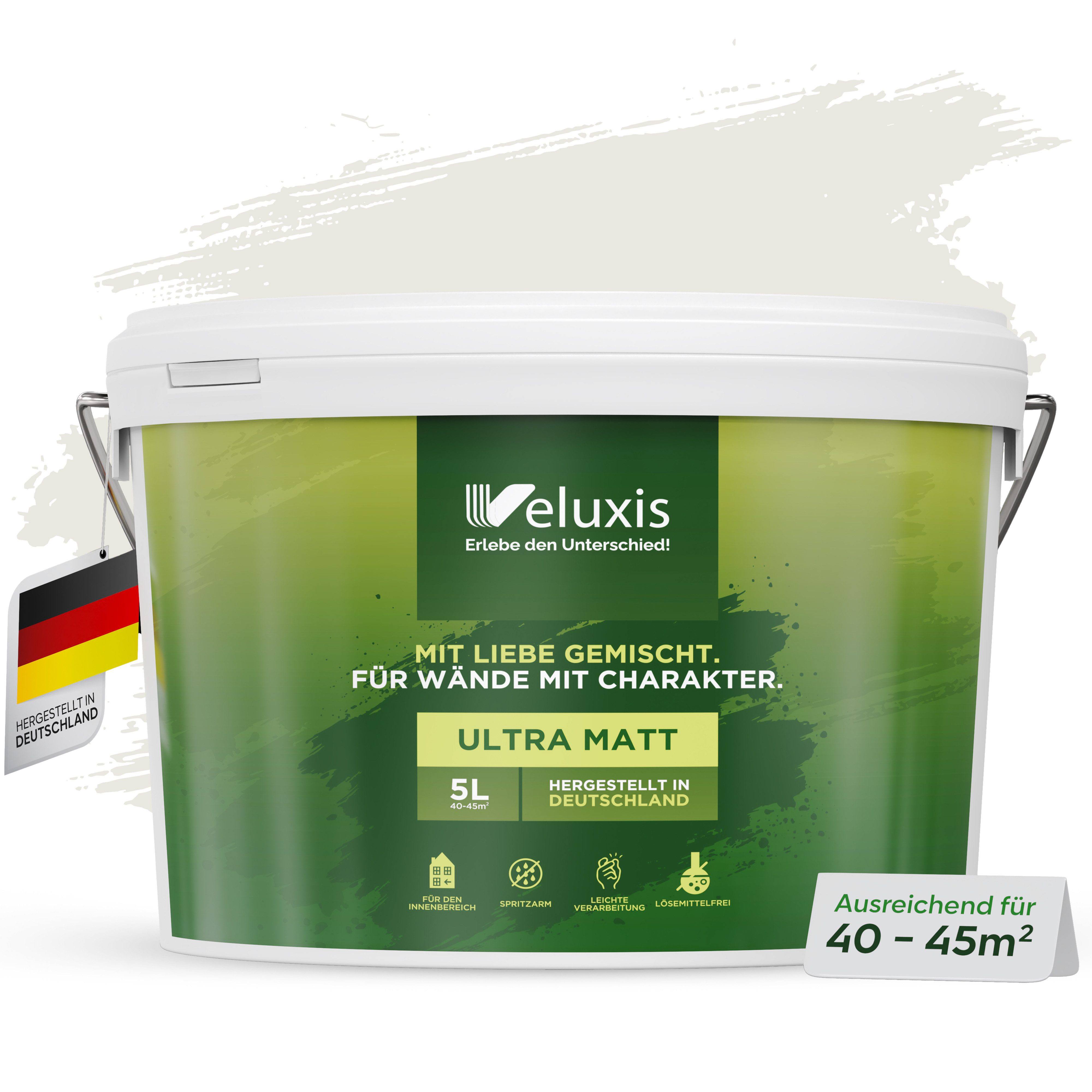 "Stilvolle Farbwelten für dein Zuhause Mit der Veluxis® Wandfarbe Universal verleihst du deinen Räumen eine zeitlose Eleganz. Unsere matte Innenfarbe schafft ein modernes, harmonisches Raumgefühl – perfekt für Wohnzimmer, Schlafzimmer, Flur oder Büro. Feine Farbtöne und eine hochwertige Oberfläche sorgen für ein stilvolles Ambiente in deinem Zuhause. Einfach streichen – perfekte Ergebnisse Dank der geschmeidigen Konsistenz lässt sich die Farbe leicht mit Pinsel oder Rolle auftragen. Selbst ohne Vorkenntnisse erzielst du ein gleichmäßiges, deckendes Ergebnis. Bereits beim ersten Anstrich überzeugt Veluxis® mit starker Deckkraft und einer satten, gleichmäßigen Farbwirkung. Ideal für DIY-Projekte, schnelle Renovierungen oder kreative Raumgestaltungen. Saubere Anwendung – tropfarm und geruchsarm Unsere spezielle Formulierung reduziert Spritzer und Kleckse auf ein Minimum. Die Farbe ist tropfarm, schnell trocknend und nahezu geruchslos – perfekt für ein sauberes und angenehmes Streicherlebnis. Zudem ist sie frei von Lösungsmitteln, emissionsarm und besonders wohnfreundlich, auch für Kinderzimmer oder Всеrgiker geeignet. Qualität „Made in Germany“ Veluxis® Wandfarben werden in Deutschland unter strengen Qualitätsstandards hergestellt. Du erhältst ein Produkt, das für Zuverlässigkeit, Langlebigkeit und gleichbleibend hohe Qualität steht. Erhältlich in 2,5 l und 5 l Gebinden Ergiebigkeit: ca. 8,5 m² pro Liter Matte, elegante Oberfläche 30 wunderschöne Farbvarianten für jede Idee Ob sanftes Beige, modernes Grau oder beruhigendes Grün – mit 30 stilvollen Farbtönen bietet Veluxis® die perfekte Auswahl für jeden Einrichtungsstil. Kreiere harmonische Wohnwelten oder setze trendige Akzente ganz nach deinem Geschmack. Entdecke deine Lieblingsfarbe und bringe frischen Wind in dein Zuhause!"