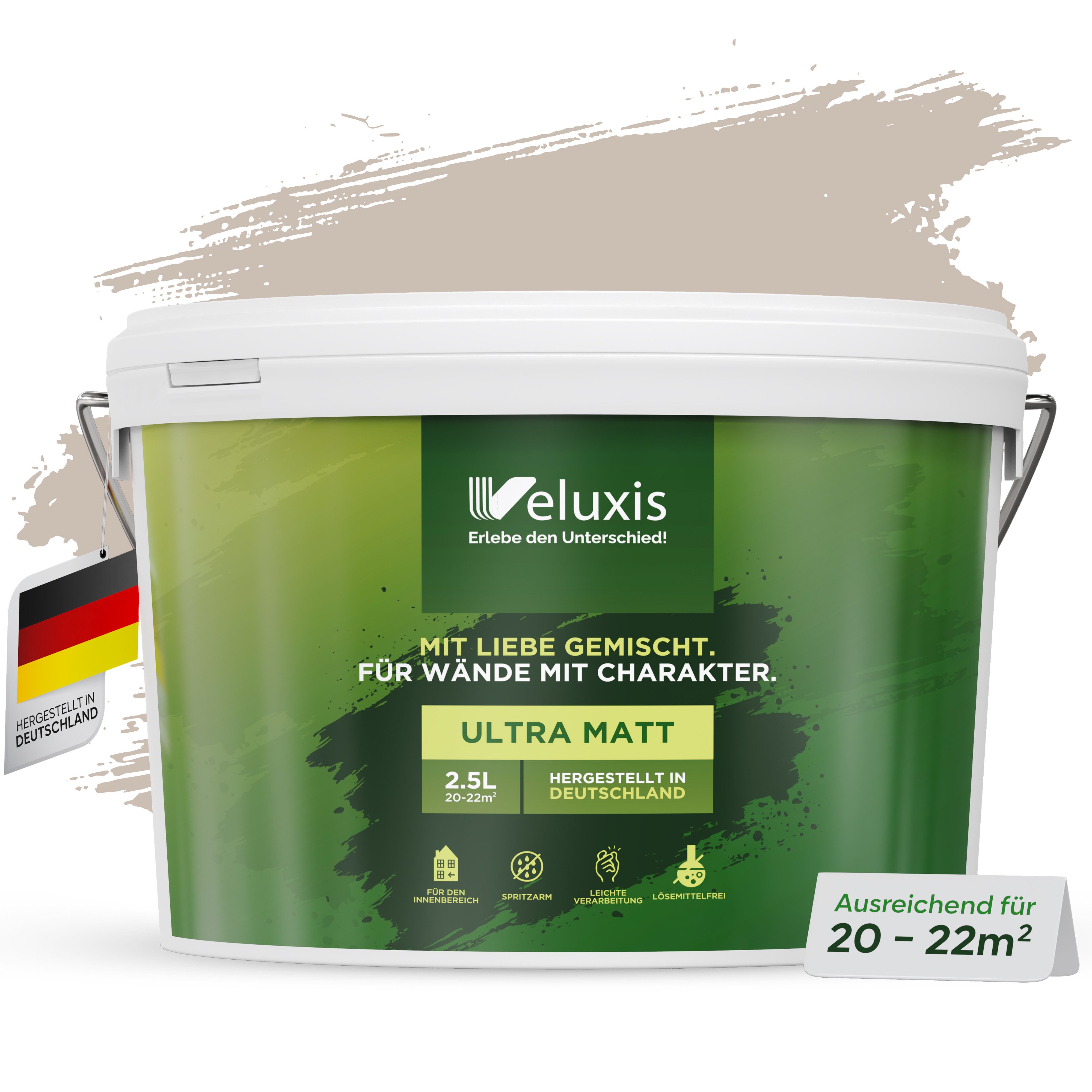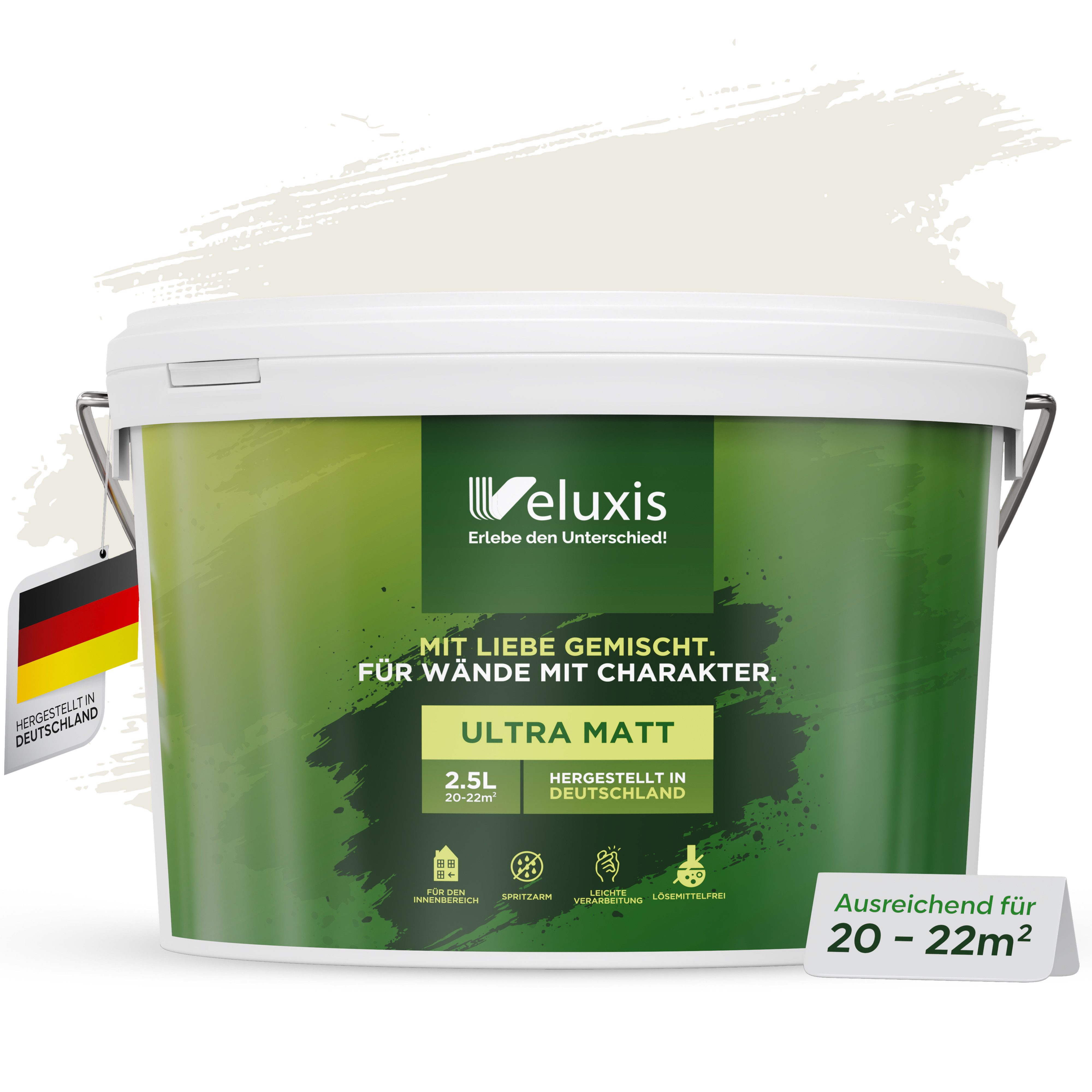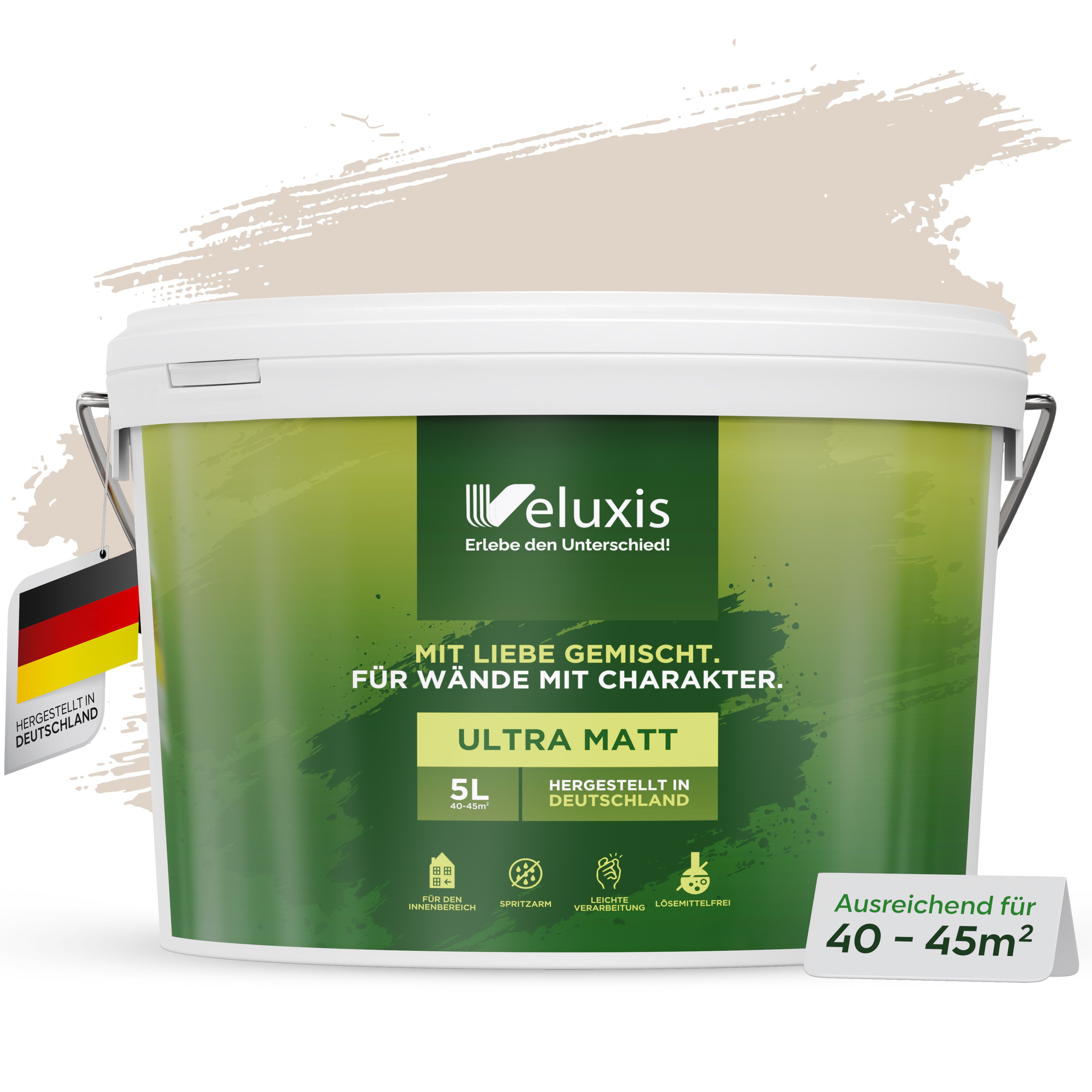 "Stilvolle Farbwelten für dein Zuhause Mit der Veluxis® Wandfarbe Universal verleihst du deinen Räumen eine zeitlose Eleganz. Unsere matte Innenfarbe schafft ein modernes, harmonisches Raumgefühl – perfekt für Wohnzimmer, Schlafzimmer, Flur oder Büro. Feine Farbtöne und eine hochwertige Oberfläche sorgen für ein stilvolles Ambiente in deinem Zuhause. Einfach streichen – perfekte Ergebnisse Dank der geschmeidigen Konsistenz lässt sich die Farbe leicht mit Pinsel oder Rolle auftragen. Selbst ohne Vorkenntnisse erzielst du ein gleichmäßiges, deckendes Ergebnis. Bereits beim ersten Anstrich überzeugt Veluxis® mit starker Deckkraft und einer satten, gleichmäßigen Farbwirkung. Ideal für DIY-Projekte, schnelle Renovierungen oder kreative Raumgestaltungen. Saubere Anwendung – tropfarm und geruchsarm Unsere spezielle Formulierung reduziert Spritzer und Kleckse auf ein Minimum. Die Farbe ist tropfarm, schnell trocknend und nahezu geruchslos – perfekt für ein sauberes und angenehmes Streicherlebnis. Zudem ist sie frei von Lösungsmitteln, emissionsarm und besonders wohnfreundlich, auch für Kinderzimmer oder Всеrgiker geeignet. Qualität „Made in Germany“ Veluxis® Wandfarben werden in Deutschland unter strengen Qualitätsstandards hergestellt. Du erhältst ein Produkt, das für Zuverlässigkeit, Langlebigkeit und gleichbleibend hohe Qualität steht. Erhältlich in 2,5 l und 5 l Gebinden Ergiebigkeit: ca. 8,5 m² pro Liter Matte, elegante Oberfläche 30 wunderschöne Farbvarianten für jede Idee Ob sanftes Beige, modernes Grau oder beruhigendes Grün – mit 30 stilvollen Farbtönen bietet Veluxis® die perfekte Auswahl für jeden Einrichtungsstil. Kreiere harmonische Wohnwelten oder setze trendige Akzente ganz nach deinem Geschmack. Entdecke deine Lieblingsfarbe und bringe frischen Wind in dein Zuhause!"