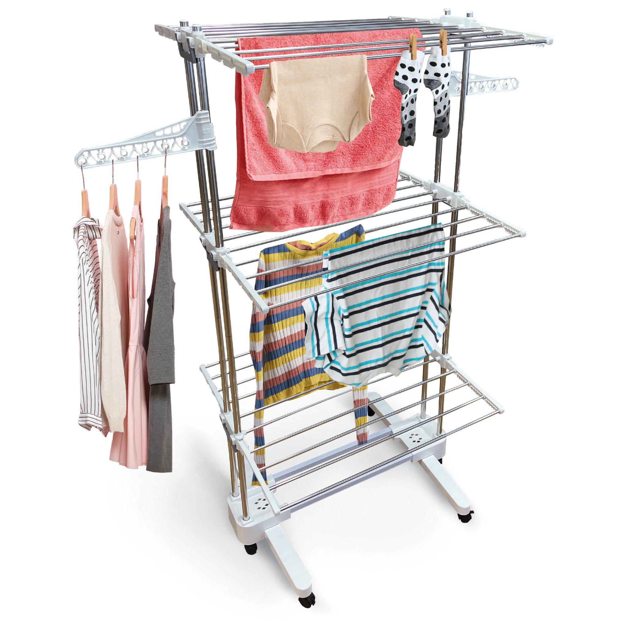 Впередe Vorteile | 6 verstellbare, klappbare Trockengestelle 2 Bügelgestelle für Kleiderbügel 4 klappbare Beine 2 Stabilisierungsstangen für Schuhe 6 selbstverriegelnde Scharniere 8 Laufrollen 144 Spezialhaken für Socken und Unterwäsche |