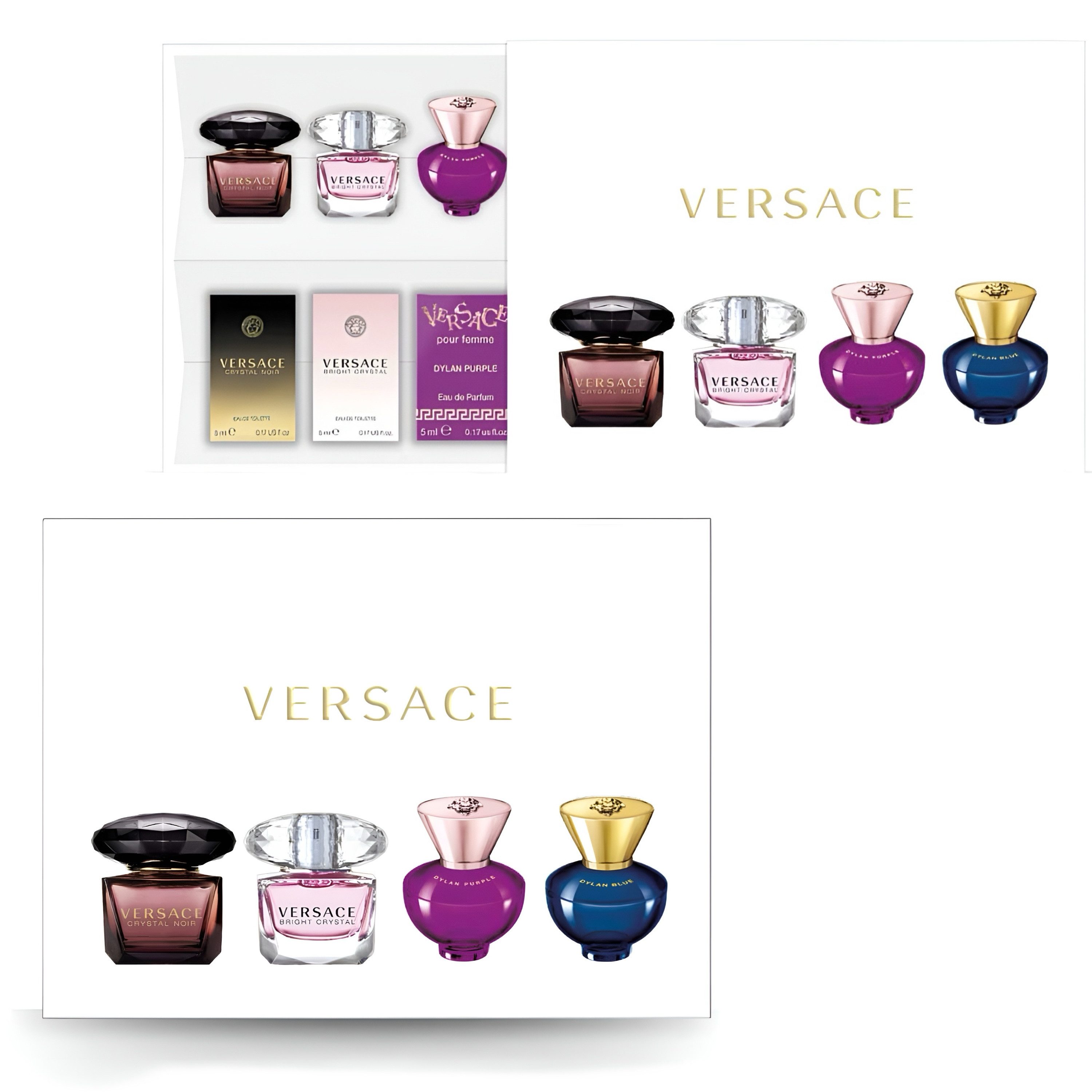 Lieferumfang | 1 x Versace Dylan Blue Pour Femme Eau de Parfum, 5 ml 1 x Versace Bright Crystal Eau de Toilette, 5 ml 1 x Versace Yellow Diamond Eau de Toilette, 5 ml 1 x Versace Dylan Turquoise Eau de Toilette, 5 ml |