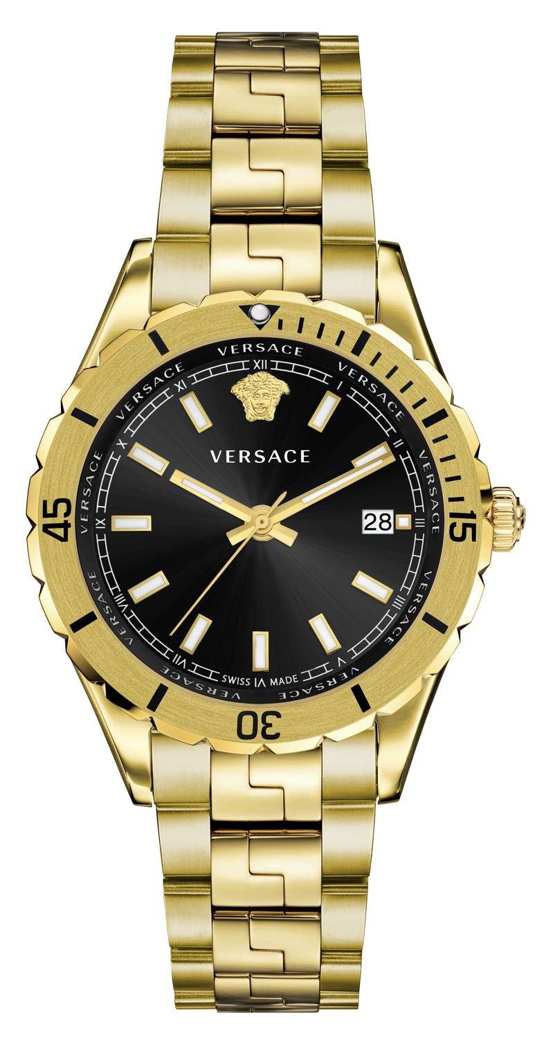 Das Zifferblatt enthält ein Datumsfenster, ein Versace-Logo im 12-Uhr-Bereich und weiße Indizes mit kleinen römischen Ziffern für die Stundenskala
