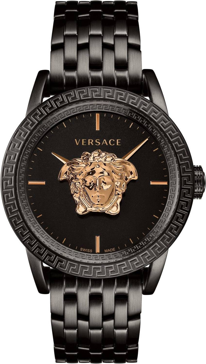 Das schwarze Zifferblatt enthält eine analoge Anzeige, roségoldene Indizes und Zeiger sowie das Versace-Logo in der Mitte.