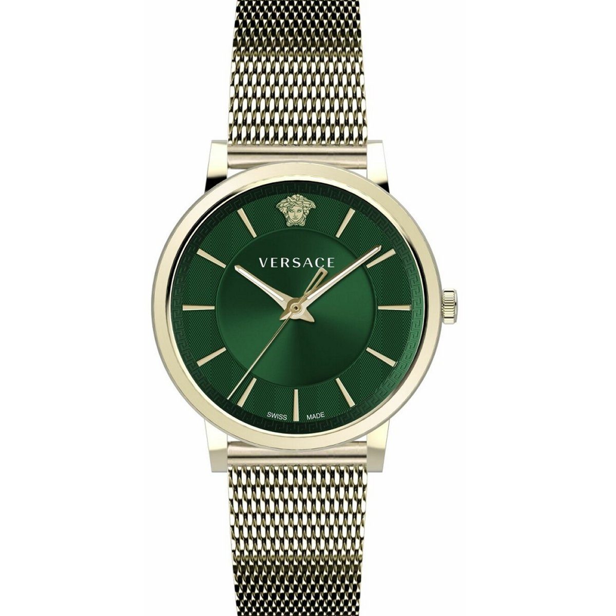 • Das grüne Zifferblatt enthält ein Versace-Logo im 12-Uhr-Bereich, Leuchtzeiger