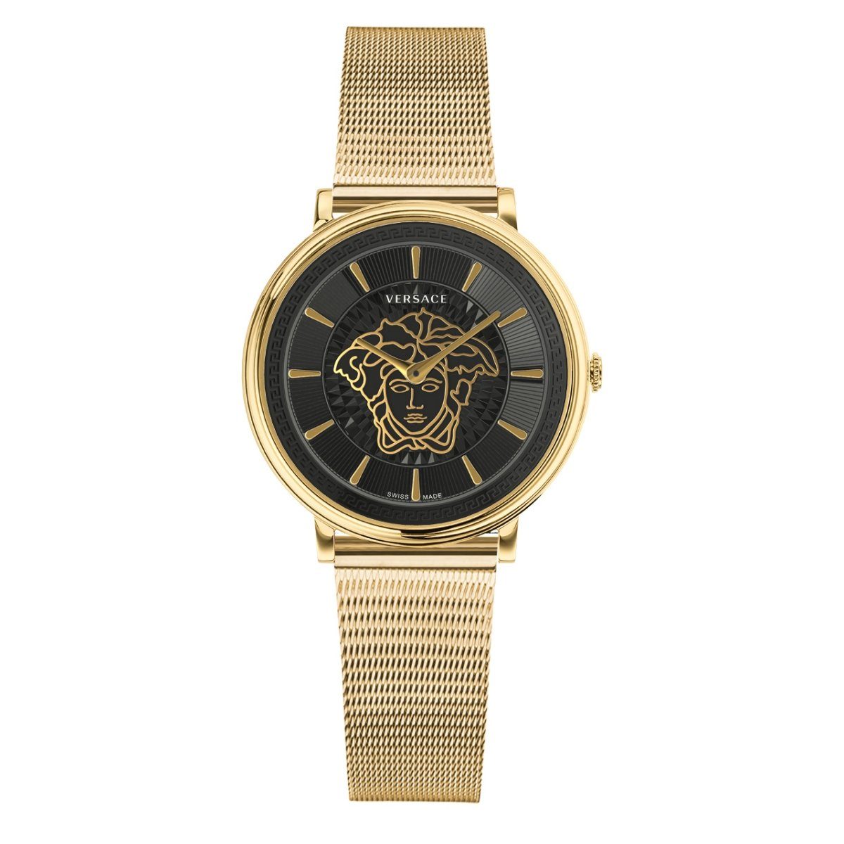 Hersteller:Versace ModellNr :VE8102119 (V-Circle) Zifferblatt:Analoganzeige, Farbe: schwarz mit Versace Logo und goldfarbene Zeiger / Indexe Gehäuse:Edelstahlgehäuse goldfarben, Durchmesser ca. 38 mm, Höhe:ca. 7 mm Gehäuseboden:Edelstahl mit Herstellerlogo Armband:hochwertiges Edelstahlarmband goldfarben Breite: ca. 1,8 cm Длина der Uhr: ca. 19 cm Faltschließe Dichtheit:Wasserdicht 5 ATM (50 m) Funktionen / Anzeigen:kratzunempfindliches Saphirglas, Batteriebetriebenes Swiss Quarz Uhrwerk Stunden - Minutenanzeige Lieferumfang:Auslieferung in Versace Geschenkbox