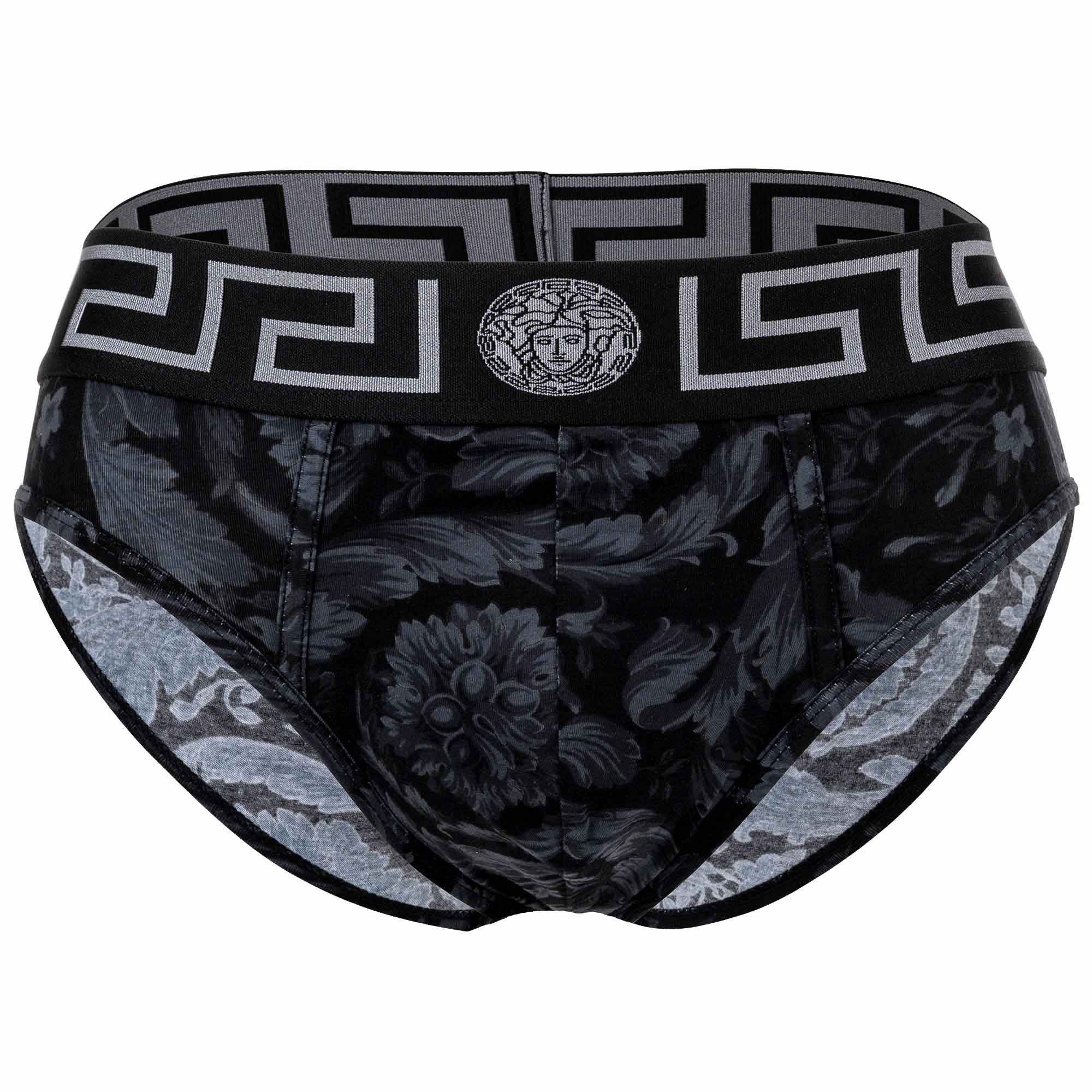 Eleganter Herren Slip der Marke VERSACE. Hochwertige Unterhosen mit Allover Barocco Print. Greca-Muster und Medusa-Motiv am elastischen Bund.