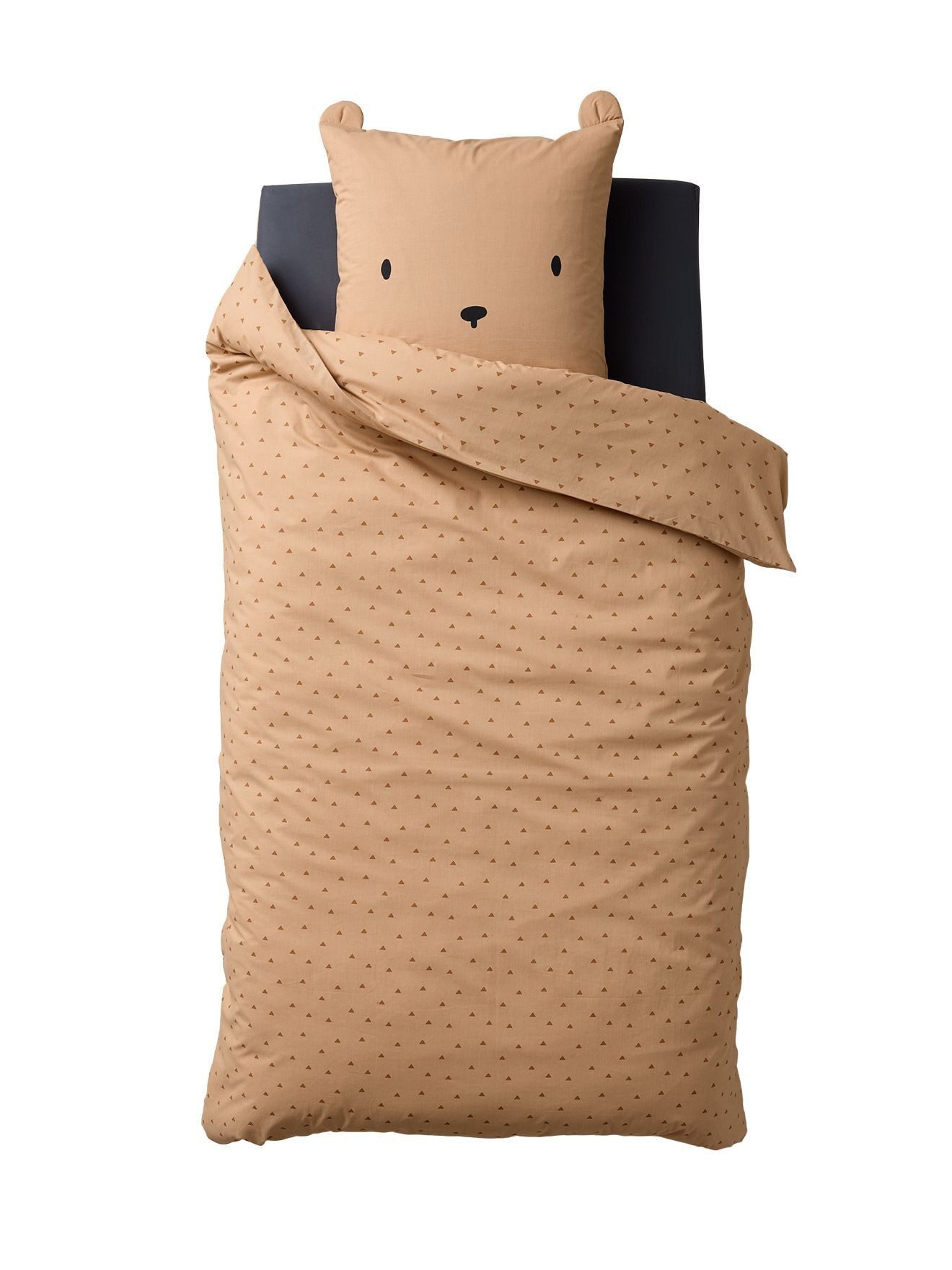 Details: Wende-Kissenbezug: Hotelverschluss. 1 Seite kleine Motive, 1 Seite Bärchengesicht mit 3D-Ohren. Bettbezug: Breiter Umschlag am Fußende. Beide Seiten mit kleinen geometrischen Motiven.
