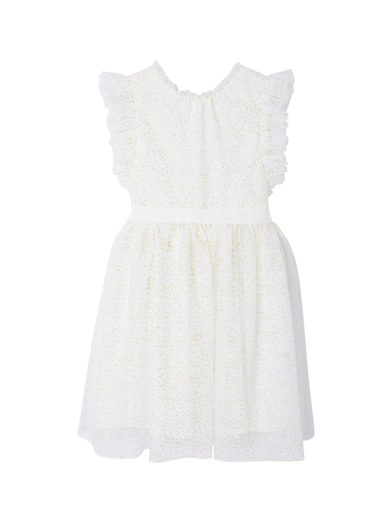 Details: V-Ausschnitt mit kleinen Tüllblumen hinten Runder Ausschnitt vorn Kurze Volantärmel Bindegürtel, hinten zu binden Verdeckter Reißverschluss hinten Weit schwingender Tüllrock Hautfreundliches Baumwollfutter