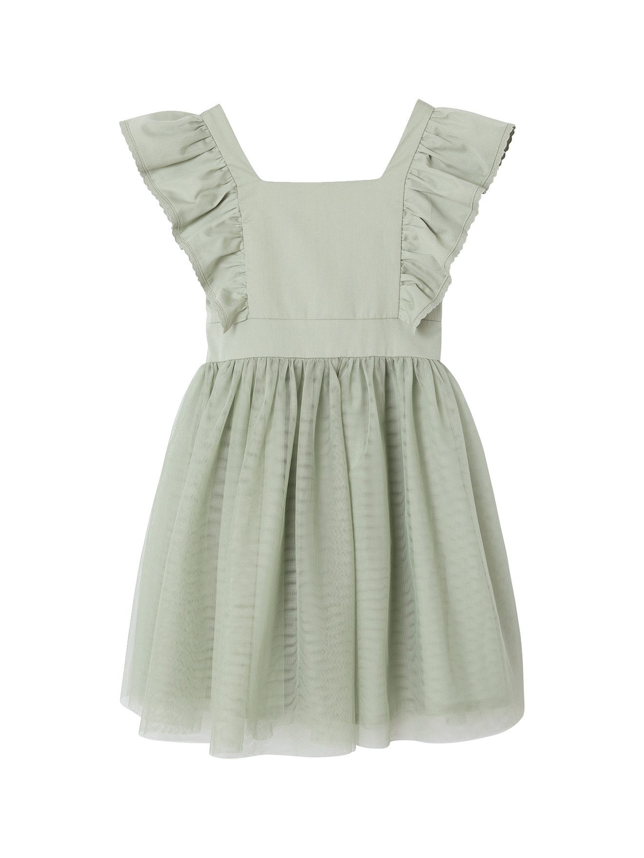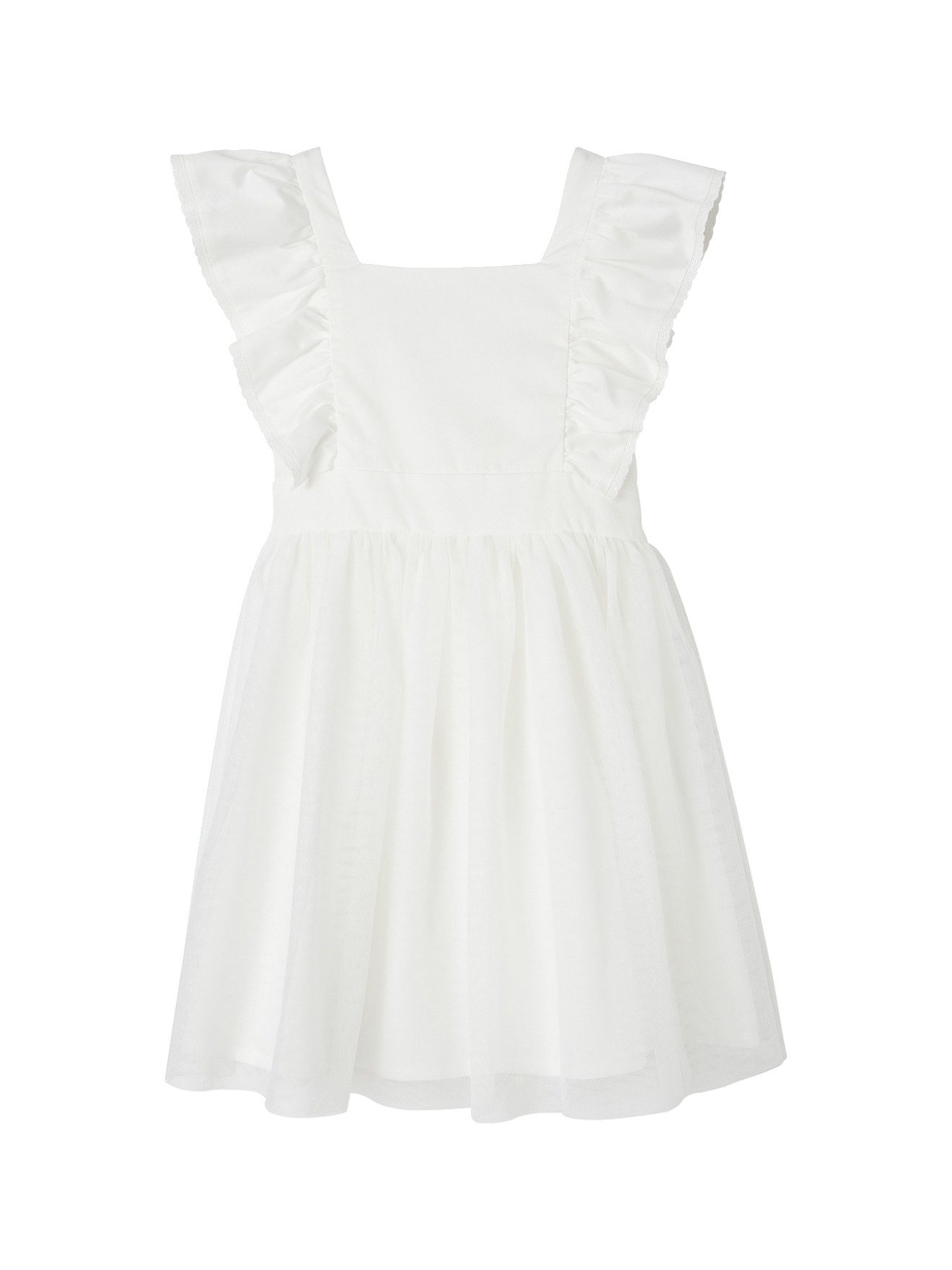 Details: Oberteil aus Musselin Gerader Ausschnitt Kurze Volantärmel Mit Voile gefüttert Verdeckter Reißverschluss hinten Festgenähter Gürtel, hinten zu binden Teilungsnaht mit Kräuselfalten in der Taille Doppellagiger, schwingender Tüllrock