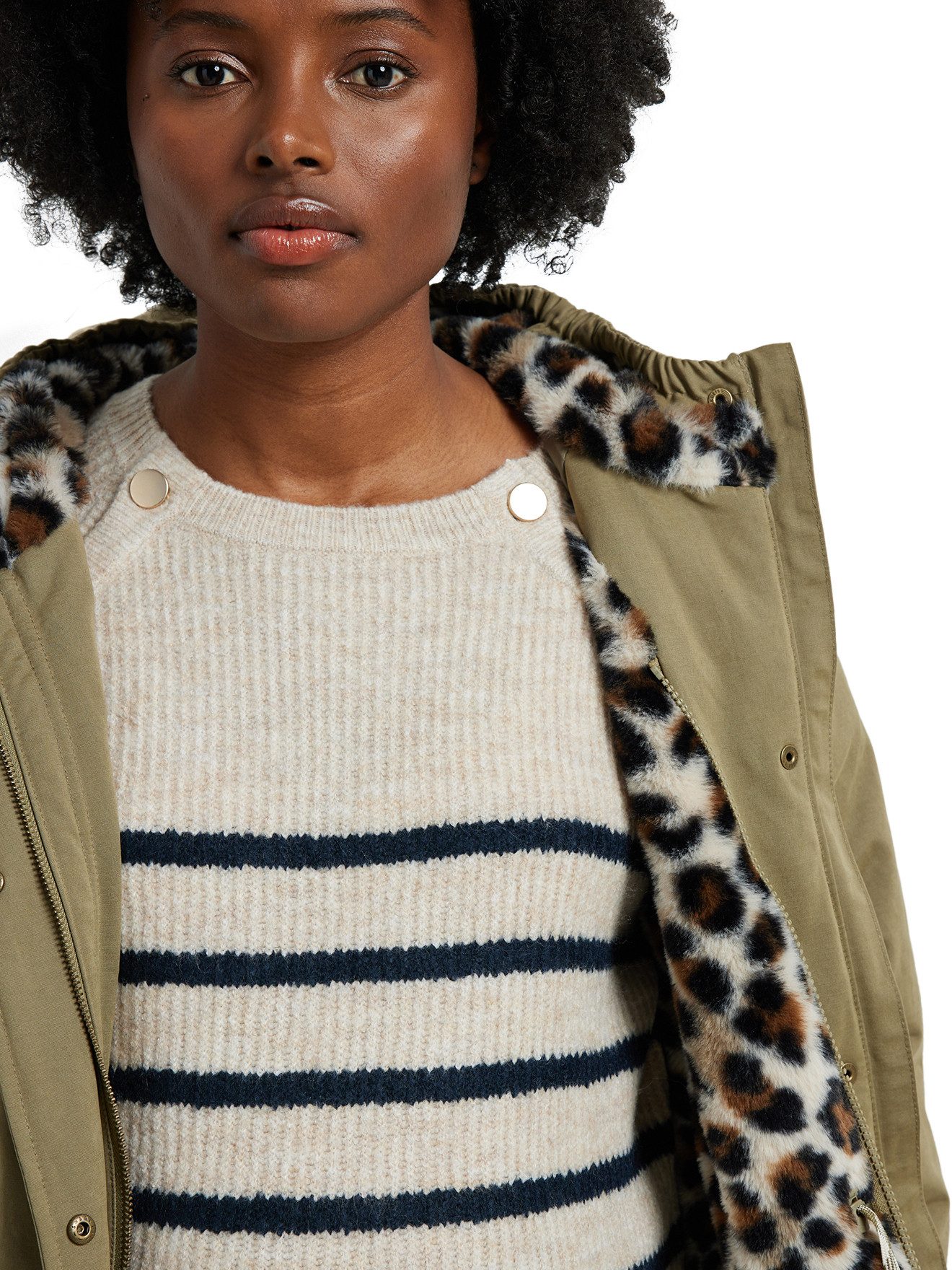 Details: Für Schwangerschaft und Stillzeit Wasserabweisend Breiter Stehkragen und Kapuze Futter in Rumpf und Kapuze mit Leopardenprint Reißverschluss unter einer Druckknopfleiste verdeckt Verstellbarer Kordelzug in der Taille, in der Kapuze und im Saum 2 große Taschen mit Druckknopfpatte Lange Ärmel mit Steppfutter Abnehmbarer Einsatz für das Baby im Tragetuch oder in der Babytrage: Futter aus Teddyfleece, Kapuze