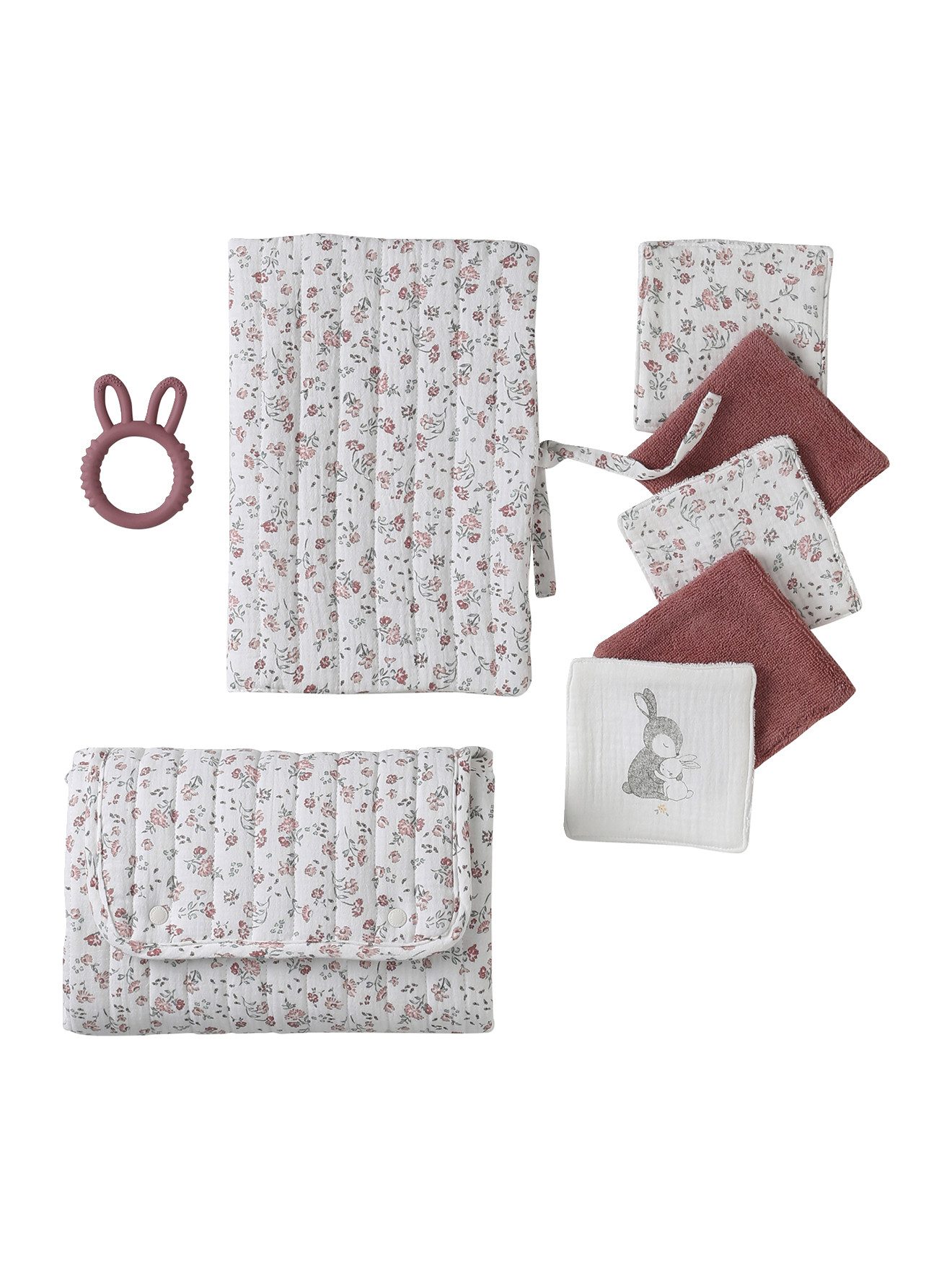 Besonderheiten: Süßes Geschenk-Set mit praktischen Baby-Essentials für unterwegs: Rassel, Wickelunterlage, 5 Mehrweg-Feuchttücher und eine Miniwickeltasche sind bereits hübsch verpackt!