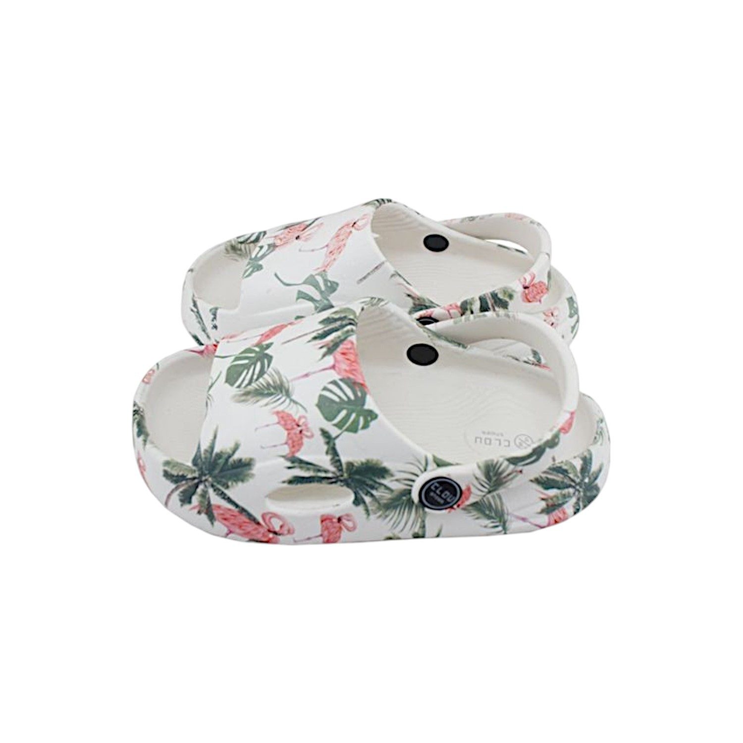 Kindgerechte Badeschlappen mit buntem Blumenmuster – ideal für Strand, Schwimmbad oder Garten.