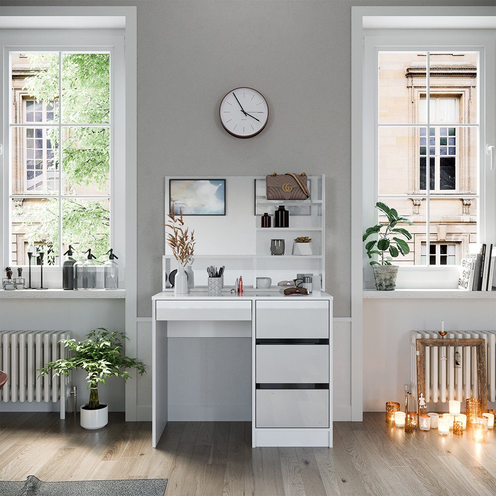 Das Set umfasst ein Spiegelregal und den Schminktisch, an dem Sie sich entspannt stylen können. Vielseitige Aufbewahrungsmöglichkeiten bieten Platz für all Ihre Schönheitsprodukte und Accessoires. Das moderne Design verleiht Ihrem Raum zeitlose Eleganz und Stil. Die einfache Montage ermöglicht Ihnen eine unkomplizierte Einrichtung Ihrer persönlichen Beauty-Oase.