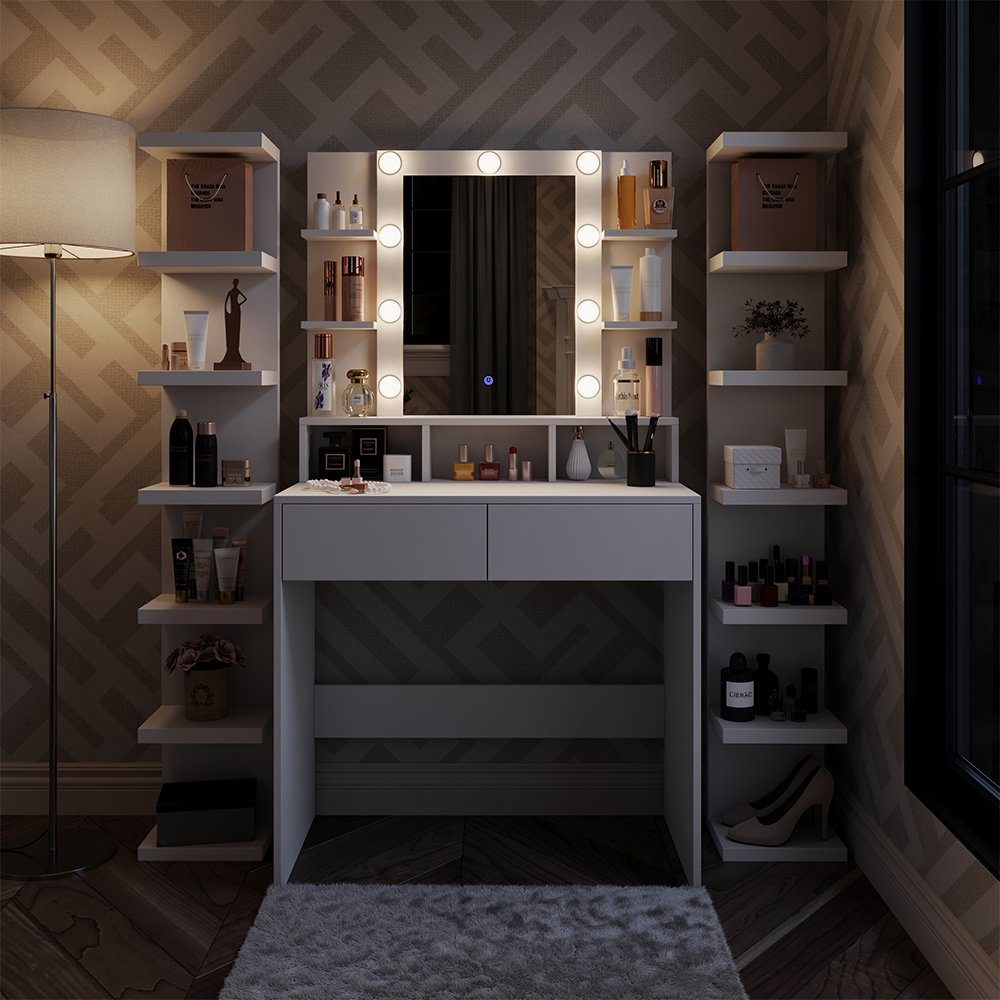 Mit dem integrierten LED-Spiegel zaubern Sie immer das perfekte Licht für Ihr Make-Up-Styling - egal zu welcher Tageszeit. Unser Schminktisch verbindet zeitlose Eleganz mit modernen Akzenten und bietet zugleich viel Stauraum für Ihre Kosmetik und Accessoires. Die Oberfläche des Tisches ist äußerst pflegeleicht, sodass Sie sich ganz auf Ihr Schönheitsritual konzentrieren können. Die Montageanleitung und das mitgelieferte Montagematerial machen den Aufbau dieses Schminktisches zu einem unkomplizierten und stressfreien Prozess.