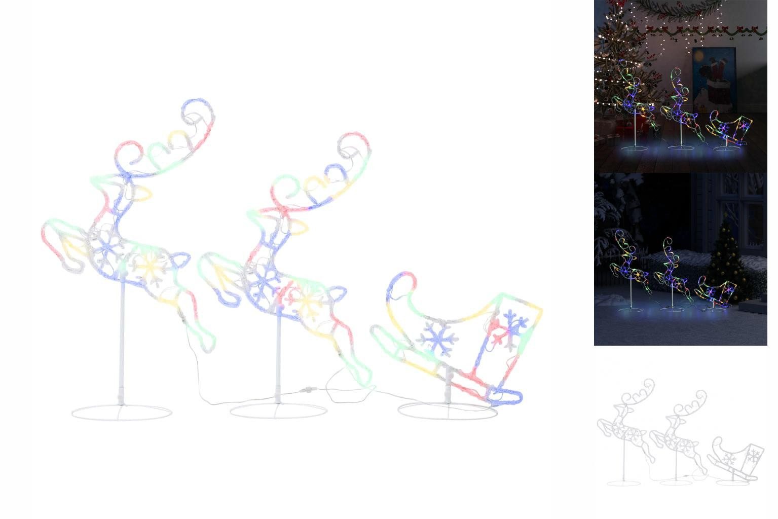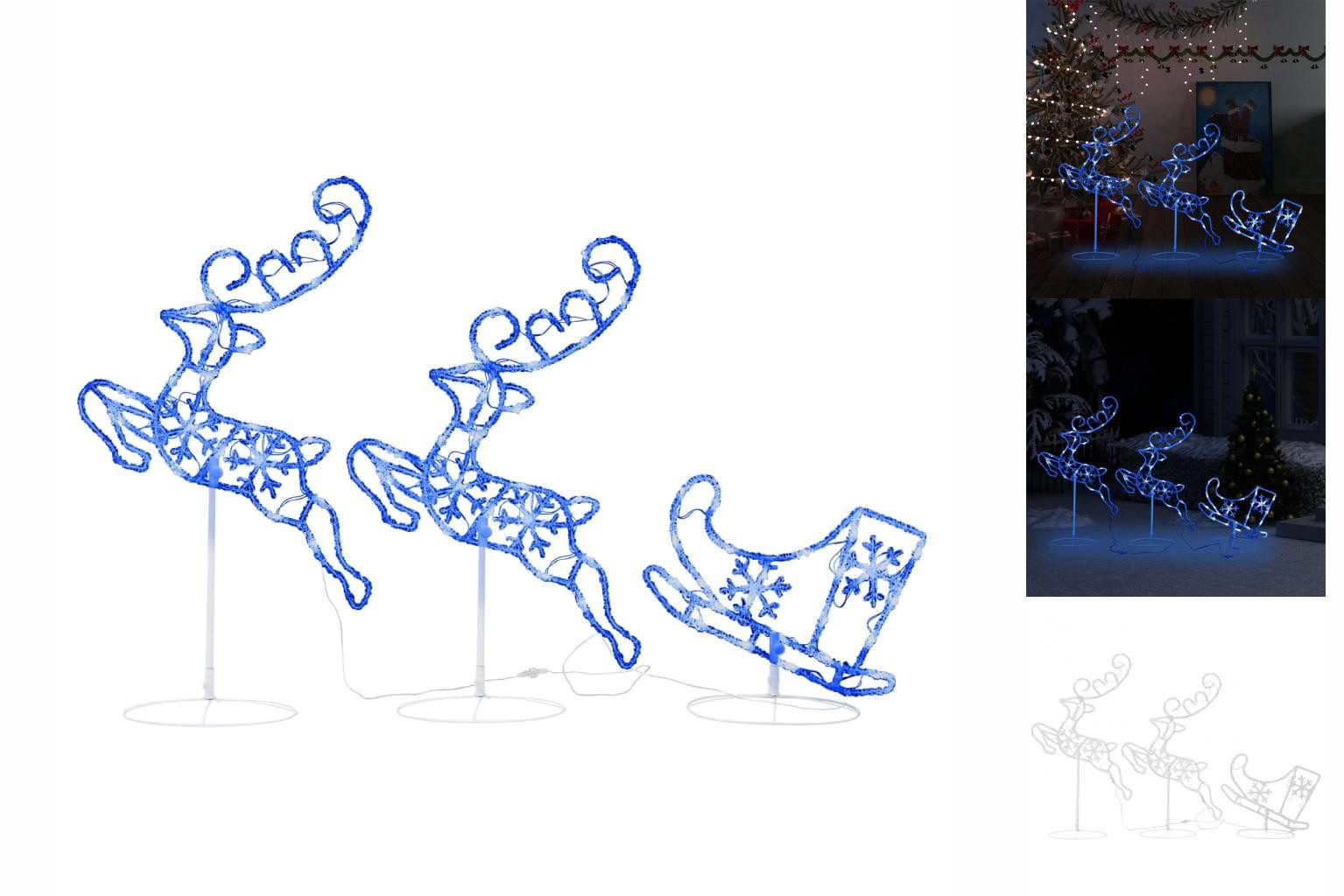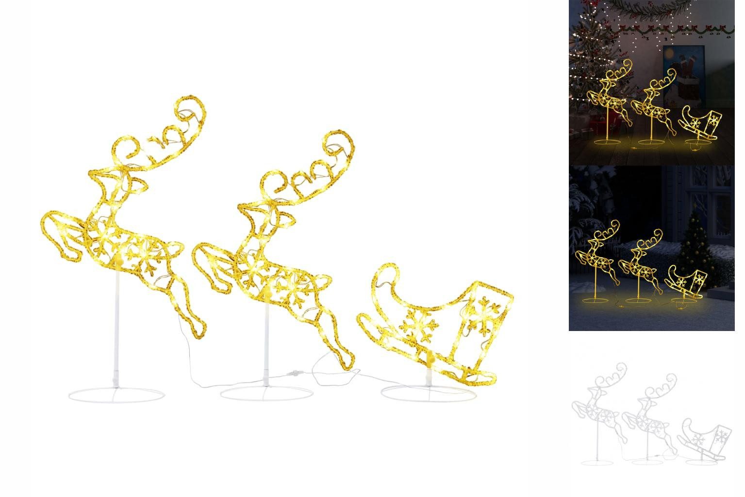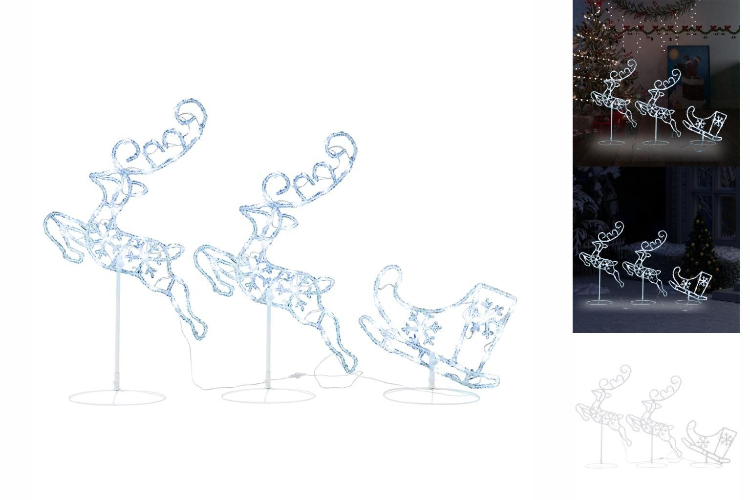 Dekorieren Sie Ihr Haus mit dieser Weihnachtsdekoration aus fliegenden Rentieren und Schlitten. Aus Acryl gefertigt, wirkt diese Weihnachtsdekoration kühl und eisig. Die leuchtende Rentier- und Schlitten-Dekoration verfügt über 72 LED-Leuchten, die energieeffizient und langlebig sind. Entworfen mit 8 verschiedenen Lichteffekten: eine Kombination aller Effekte, langsames Leuchten, Funkeln/Blitzen, Wellen, jagend/fließendes Wasser, sequentiell, stetig an und langsames Ausblenden, diese LED-Weihnachtsdekoration leuchtet wunderschön und schafft eine magische Atmosphäre. Zusätzlich trägt der mitgelieferte Ständer zur Stabilität bei.