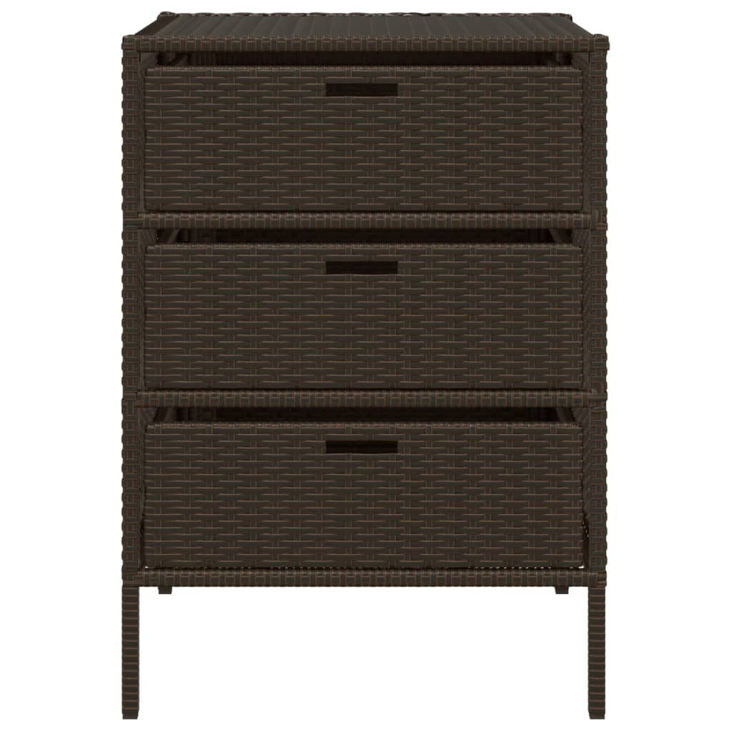 Dieser Outdoor-Schrank eignet sich perfekt, um deine Decken, Kissen, Gartenbedarf, Pooltücher und andere Gegenstände ordentlich und leicht zugänglich aufzubewahren. Langlebiges Material: PE-Rattan, auch als Poly Rattan bekannt, ist ein robustes, pflegeleichtes synthetisches Material, das die Optik von natürlichem Rattan aufweist. Es kennzeichnet sich durch ein geringes Eigengewicht und lässt sich einfach reinigen. Aufgrund seiner Haltbarkeit und Witterungsbeständigkeit wird es häufig bei der Herstellung von Gartenmöbeln verwendet.Viel Stauraum: Dieser Outdoor-Aufbewahrungsschrank verfügt über 3 Schubladen zur Aufbewahrung deiner Gartengeräte, Poolspielzeuge, Outdoor-Kissen und mehr.Robuster und stabiler Rahmen: Dank des pulverbeschichteten Stahlrahmens ist das Outdoor-Möbel robust, stabil und für den täglichen Einsatz im Außenbereich geeignet. AchtungUm ein Umkippen zu vermeiden, sollte dieses Produkt mit der mitgelieferten Wandhalterung gesichert werden. Gut zu wissen:Wir empfehlen dir, deine Gartenmöbel mit einer wasserdichten Hülle zu schützen, um lange Zeit eine ansprechende Optik aufzuweisen.