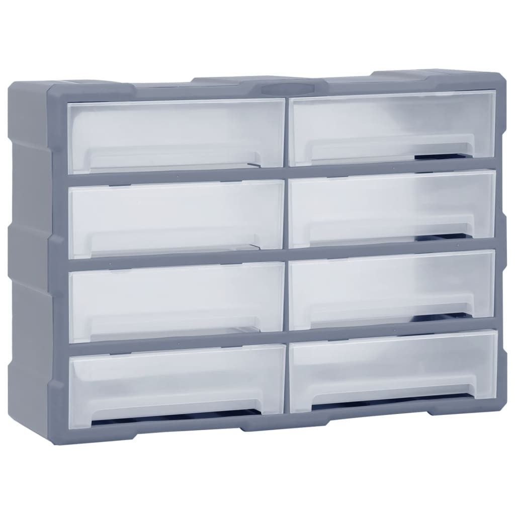 Dieser Multi-Schubladen-Organizer mit insgesamt 8 großen Schubladen ist für die übersichtliche Aufbewahrung einer Vielzahl von Gegenständen konzipiert. Er kann auch als Näh- oder Nagelkasten verwendet werden. Diese Aufbewahrungseinheit enthält 8 große Schubladen, um mehr Stauraum zu bieten. Es hält Ihre Handwerkzeuge und Zubehörteile wie Befestigungselemente organisiert und in Reichweite. Die Lagerboxen bestehen aus schlagfestem Kunststoff, der sowohl langlebig als auch robust ist. Die Schubladen bestehen aus durchsichtigem Kunststoff, damit Sie deren Inhalt schnell identifizieren können. Die Sichtlagerboxen sind ideal für die Aufbewahrung von Schraubenmuttern, Bolzen, Schrauben, Nägeln, Befestigungselemente und Komponenten. Dieser Artikel kann an der Wand montiert und einzeln als Werkzeug-Organizer verwendet werden.