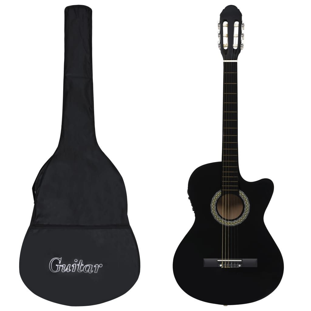 Diese Western-Cutaway-Gitarre ist ein großartiges Instrument für Anfänger, Amateure und Musiker auf jedem Niveau. Neben der Gitarre enthält das Set eine Gitarrentasche, einen Gurt, Picks, Pick-Halter, Gitarrensaiten-Set, Saitenkurbel, Capo, chromatisches Stimmgerät und Gitarrenständer. Diese Gitarre besteht aus massivem Lindenholz mit Stimmwirbeln und Griffbrett aus Hartplastik. Sie verfügt über 6 Saiten und einen 4-Band-EQ (Equalizer), der die Gitarre beim Anschluss an die Lautsprecherbox stimmt. Die hervorragende Klangqualität und das schöne Design machen die Gitarre sehr hochwertig. Mit einer Размер von 65 cm bietet diese Akustikgitarre alles, was Sie brauchen, um der nächste Gitarrist zu werden. Das Stimmgerät kann helfen, die Gitarrensaiten besser zu stimmen, während der Kapodaster dafür zuständig ist, den Ton der Gitarre anzupassen. Die 3 Picks werden zum Zupfen von Saiten verwendet und können in den Pick-Halter gesteckt werden. Sie werden normalerweise als Ersatz für die Finger verwendet, können aber auch mit den Fingern zusammen gespielt werden. Die Saitenkurbel, ein nützliches Werkzeug, erleichtert das Ersetzen der Saiten. Die im Lieferumfang enthaltene Tasche mit einem Gurt ist für reisende Musiker und für das einfache Verstauen bestens geeignet. Zusätzlich können Sie Ihre Gitarre jederzeit in den Gitarrenständer stellen. Das Gitarren-Set ist einfach zu montieren.
