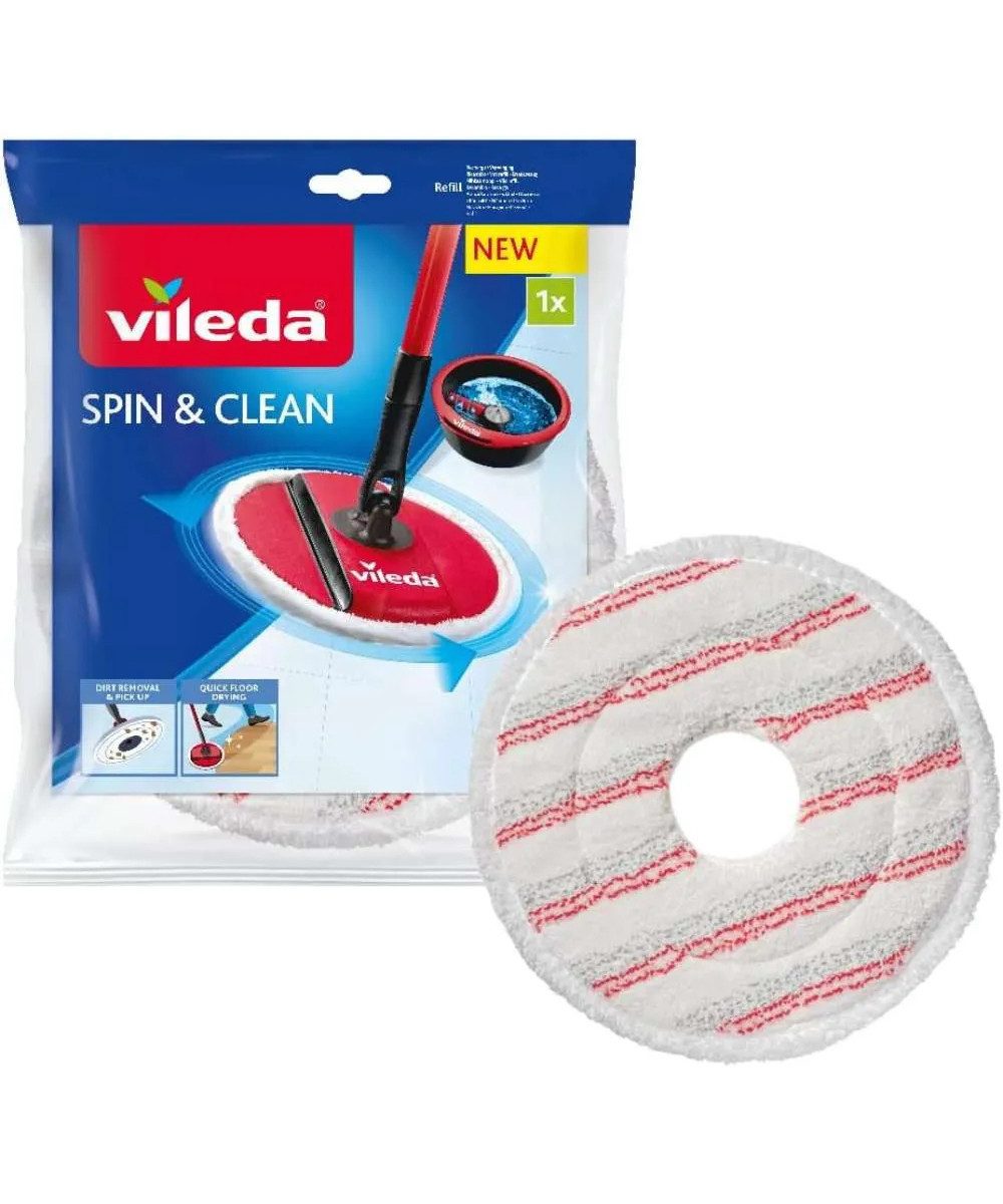 Der Vileda Ersatzbezug für den Rotationswischer Spin & Clean reinigt effektiv harte Böden wie Fliesen, Parkett und Laminat. Aus hochwertiger Mikrofaser gefertigt, kann er bei bis zu 60 °C gewaschen werden.