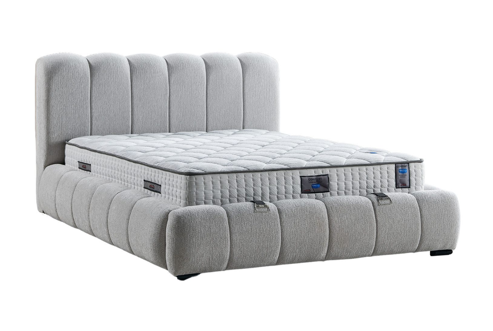 Das Comfort Bett vereint modernes Design mit herausragendem Komfort und hochwertiger Verarbeitung. Sein markantes, rundum gepolstertes Kopf- und Fußteil mit vertikaler Steppung verleiht dem Bett eine luxuriöse Optik und sorgt gleichzeitig für ein angenehmes Liegegefühl. Der weiche Stoffbezug in dezentem Hellgrau schafft eine beruhigende Atmosphäre und fügt sich harmonisch in verschiedene Einrichtungsstile ein.Die großzügige Liegefläche bietet eine optimale Unterstützung für erholsamen Schlaf. Die hochwertige Polsterung sorgt für eine angenehme Haptik und rundet das elegante Design perfekt ab. Durch seine stabile Konstruktion bleibt das Bett langlebig und bietet eine zuverlässige Basis für verschiedenste Matratzentypen.Mit seinem stilvollen Look, der weichen Stoffpolsterung und der ergonomischen Gestaltung ist das Comfort Bett die perfekte Wahl für alle, die Wert auf Design und Komfort legen.