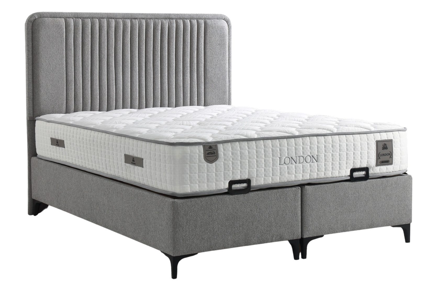 Das London Bett mit Bettkasten in Mense Grau vereint modernes Design mit praktischem Stauraum. Das hohe, gepolsterte Kopfteil mit vertikaler Steppung verleiht dem Bett eine elegante Optik und sorgt für eine stilvolle Atmosphäre im Schlafzimmer. Die ergonomische Federkernmatratze bietet hervorragenden Liegekomfort und unterstützt die Wirbelsäule optimal für einen erholsamen Schlaf. Der großzügige Bettkasten ermöglicht eine platzsparende Aufbewahrung von Bettwäsche, Kissen oder Decken und lässt sich dank des leichtgängigen Öffnungssystems mühelos bedienen. Der weiche und zugleich strapazierfähige Mense-Stoff in Grau sorgt für eine moderne Optik und ist pflegeleicht. Das London Bett mit Bettkasten ist in verschiedenen Größen, Matratzenoptionen und Kopfteildesigns erhältlich – die perfekte Wahl für stilbewusste Schlafräume.