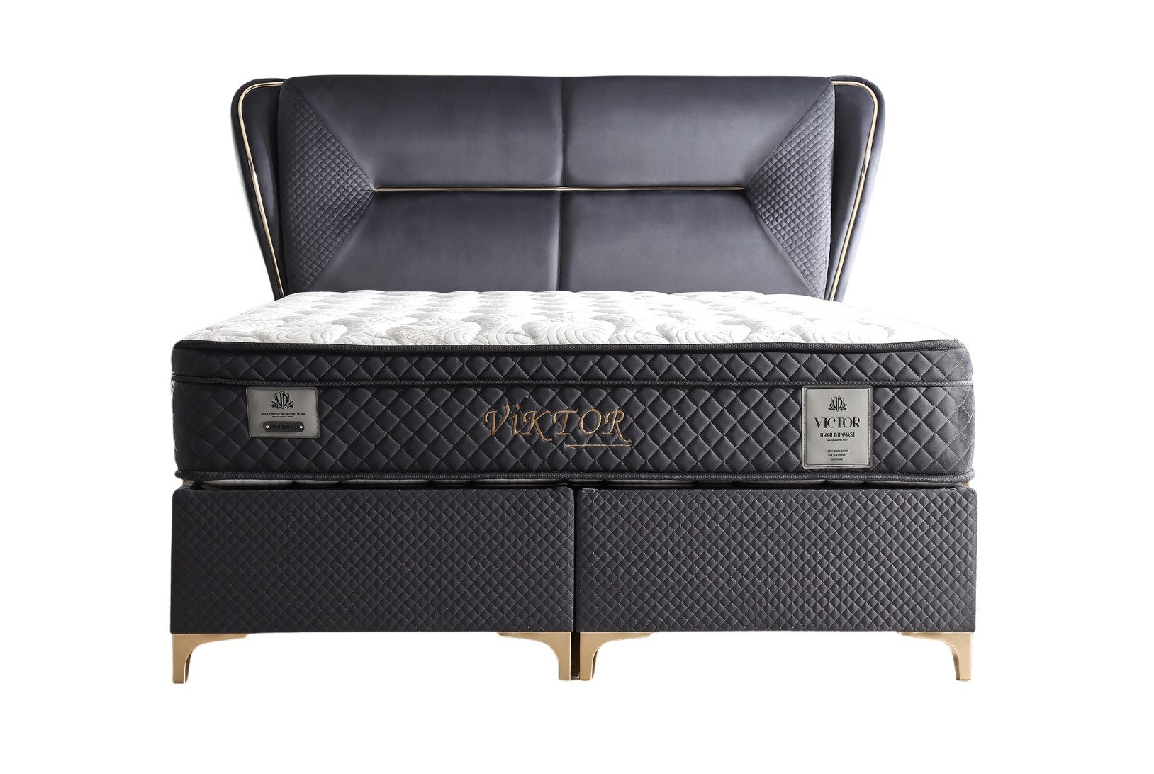 Das Viktor Bett kombiniert klare Linien mit abgesetzten Strukturen. Das hohe Kopfteil ist gepolstert und wird durch seitliche Flügel mit abgesteppten Flächen ergänzt. Goldfarbene Akzente betonen das Design und setzen Kontraste zum dunkelblauen Stoffbezug.