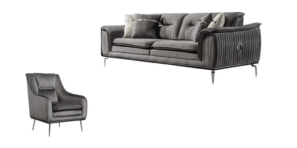 Das Bologna Sofa Set vereint modernes Design mit luxuriösem Komfort. Der hochwertige Samtstoff in Grau sorgt für eine elegante Optik und eine besonders weiche Haptik, die zum Entspannen einlädt. Die stilvolle vertikale Steppung an den Seiten verleiht dem Sofa eine raffinierte Note und setzt edle Akzente. Dank der umklappbaren Rückenlehne lässt sich das Sofa im Handumdrehen in eine großzügige Liegefläche verwandeln – perfekt für Gäste oder entspannte Abende. Die verchromten Metallfüße bieten nicht nur stabilen Halt, sondern unterstreichen das moderne und stilvolle Design. Mit seinem Mix aus Eleganz, Funktionalität und Komfort ist das Bologna Sofa Set eine erstklassige Wahl für stilbewusste Wohnräume.