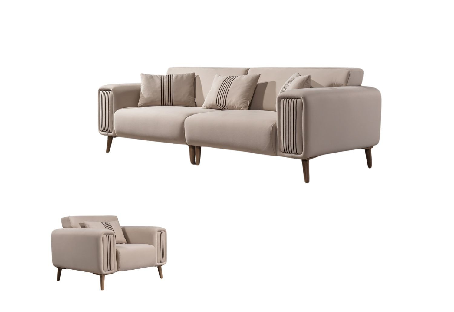 Die breiten Sitze und die sanft gepolsterten Armlehnen bieten angenehmen Sitzkomfort. Der strukturierte Stoffbezug trägt zu einer hochwertigen Optik bei und lässt sich leicht in moderne und klassische Wohnräume integrieren.