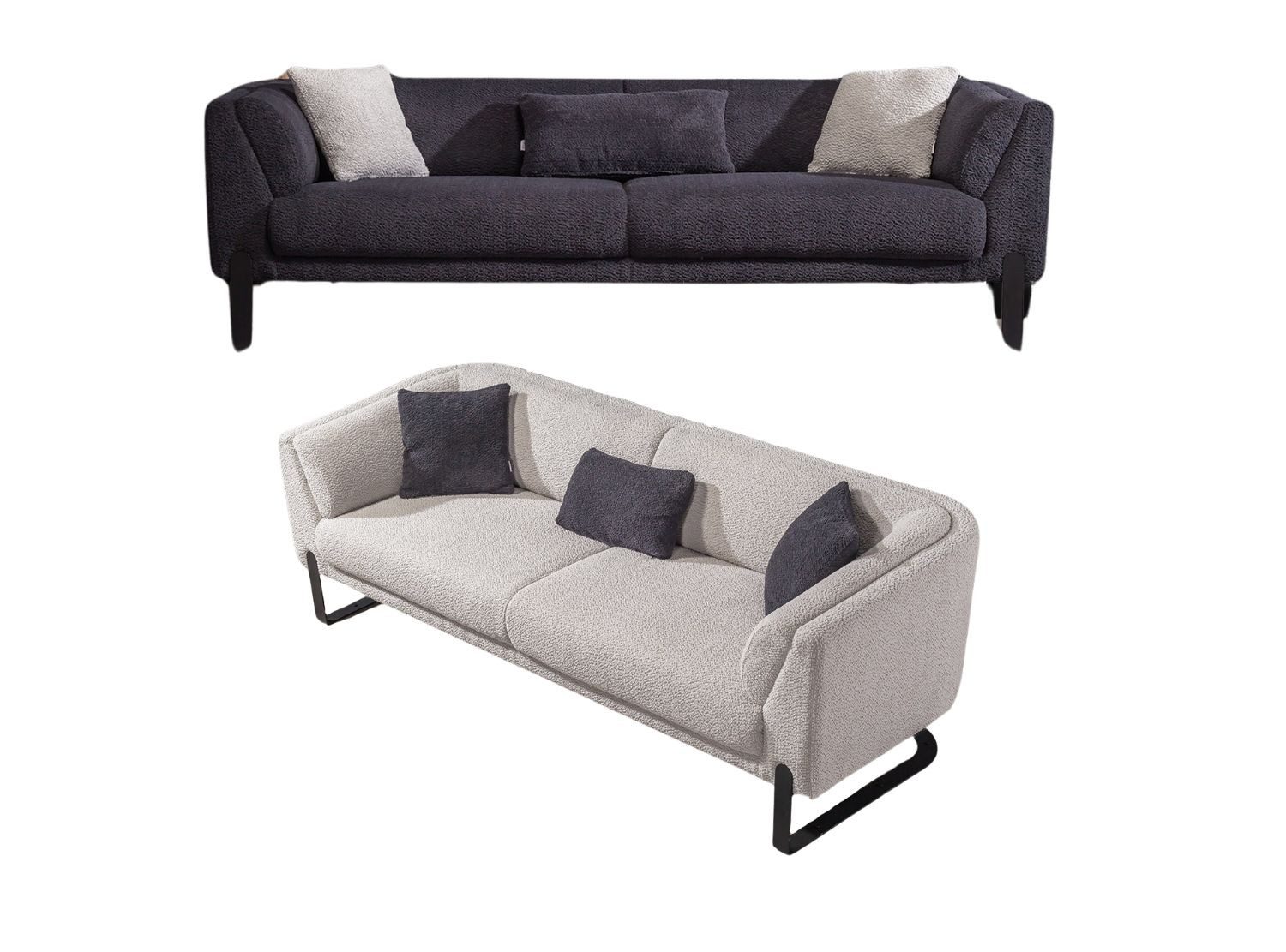 Dieses Sofa-Set kombiniert modernes Design mit einer schlichten, eleganten Ästhetik und fügt sich harmonisch in verschiedene Wohnkonzepte ein. Es besteht aus zwei geräumigen Sofas und einem bequemen Sessel. Die klaren Linien, geschwungenen Armlehnen und hellen Polster sorgen für eine freundliche und einladende Atmosphäre. Die schwarzen Metallfüße setzen einen stilvollen Kontrast und verleihen dem Set eine schwebende Optik.