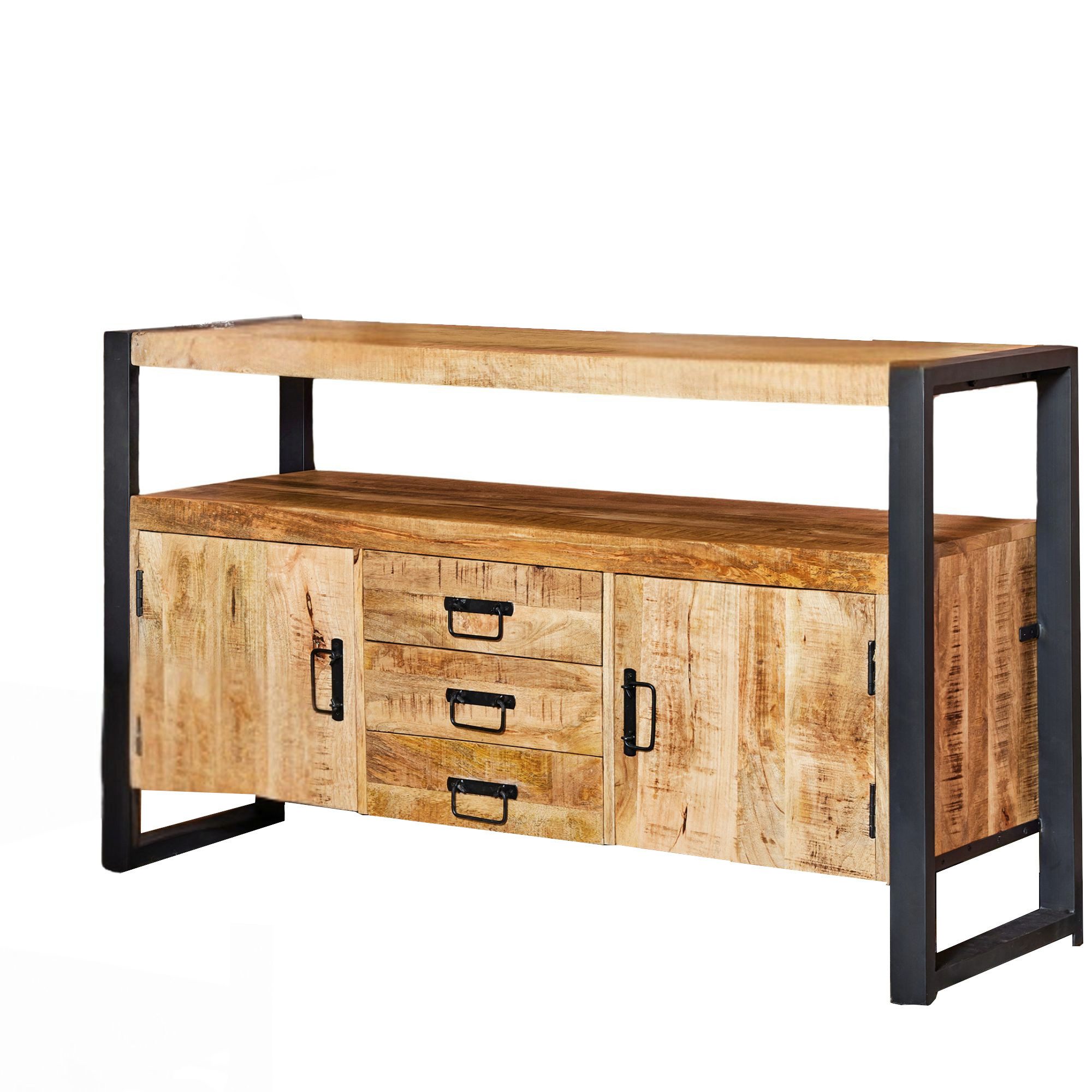 Das Sideboard Zavan präsentiert sich in einer Ausführung aus Mangoholz. Der Metallrahmen und die Metallgriffe sind mit schwarzem Lack überzogen. Dieses Modell ist mit zwei Türen und sechs Schubladen ausgestattet. Hinter den Türen befinden sich Regale. Mehrere Streifen aus lackiertem Holz sind in das Sideboard eingef ügt, was dem Möbelst ück seinen zeitgenössischen Charakter verleiht.Hinweis:Abmessungen Breite: 200/175/160/135 cm Tiefe: 40 cm Höhe: 80 cm Pflege: mit einem leicht feuchten Tuch abwischen.