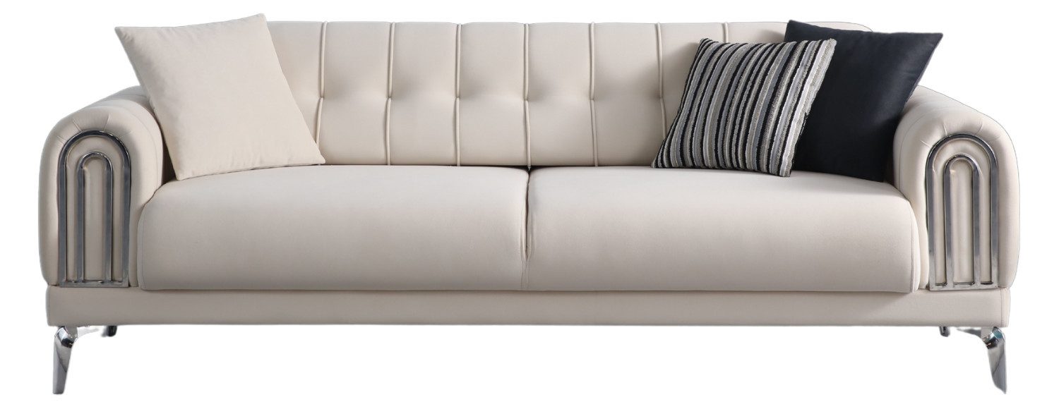 Das Lejla Sofa begeistert mit seinem weichen Samtstoff in Anthrazit oder Creme, der eine elegante und luxuriöse Atmosphäre schafft. Die dezenten, aber modernen Kunststofffüße in Chrome ergänzen das Design stilvoll und sorgen für Stabilität.