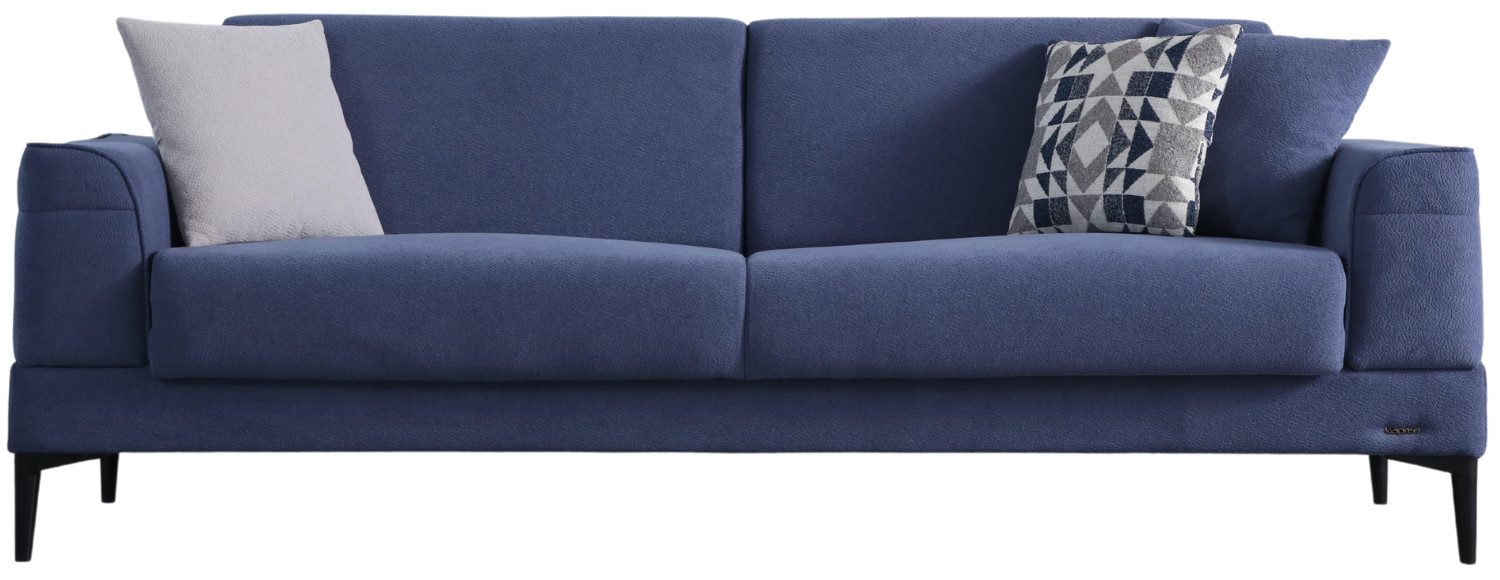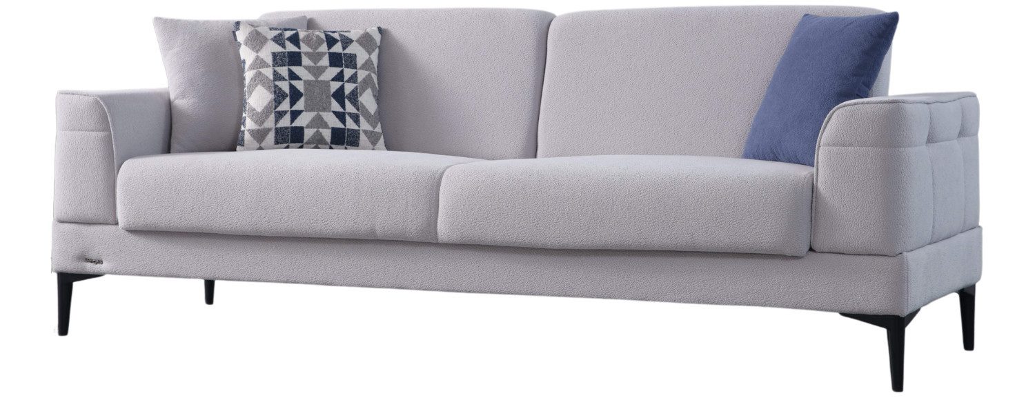 Das Maja Sofa überzeugt mit seinem weichen Bouclé-Stoff in Blau oder Grau, der eine gemütliche und stilvolle Atmosphäre schafft. Die schwarzen Kunststofffüße sorgen für Stabilität und einen modernen Akzent.