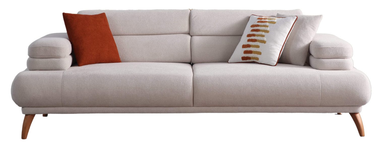 Das Sevda Sofa kombiniert organische Linienführung mit wohnlichem Bouclé-Stoff in Creme oder Terracotta. Die sanft geschwungenen Armlehnen und sichtbaren Holzfüße verleihen dem Design eine natürliche Leichtigkeit, während die gepolsterten Sitzflächen für echten Komfort sorgen.